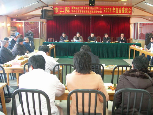 2008年2月2日,阜阳市二院召开了2008年迎春座谈会。全院离退休县处级老干部、退休专家、各民主党派人士、无党派人士,以及院各科室主任、护士长集聚一堂,共庆2007年度全院取得的辉煌成绩,并围绕全院当前在发展中存在的困难和问题,进行了座谈。