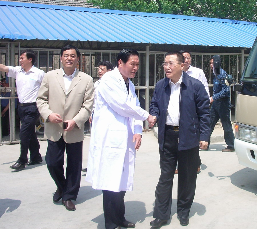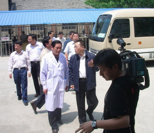 5月2日,省委书记王金山到阜阳市二院检查手足口病防治工作。图为王金山在市委书记宋卫平等陪同下在市第二人民医院慰问奋战在一线的医护人员,检查救治工作开展情况。(李秀勇摄)