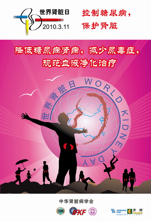 2010年的世界肾脏日是 3月11日。中华肾脏病学会将与国际肾脏病学会同步开展CKD的宣传工作。今年的主题是:“降低糖尿病肾病,减少尿毒症,规范血液净化治疗”。随着我国经济的发展,人民生活水平的提高和生活方式的变化,糖尿病的发病逐年升高。目前我国糖尿病患者约4000余万,每天新增病人300,每年增病人120万;据专家预测,到2025年我国糖尿病患者总数可能增加到1亿人,糖尿病防治形势严峻。糖尿病患者约30%可合并糖尿病肾病,引起肾功能不全、尿毒症。在欧美、日本等发达国家,糖尿病肾病已经是尿毒症的最主要病因。但是糖尿病肾病又是可预防和治疗的疾病,关键在于早期发现,合理治疗。为此,今年的世界肾脏日主题设定为“降低糖尿病肾病,减少尿毒症,规范血液净化治疗”。目的在于使社会公众了解、加深对糖尿病肾病这一CKD的重要病因的认识,重视其防治和危害。让我们共同应对CKD的挑战,积极行动起来吧!