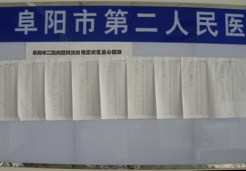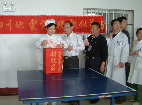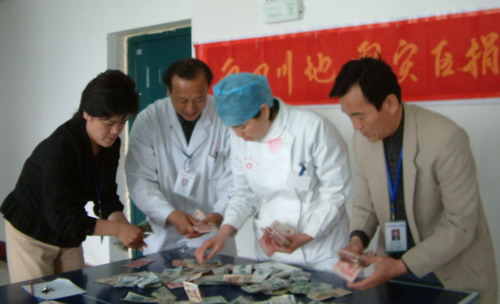 四川5月12日发生的汶川8级特大地震造成了重大人员伤亡和经济损失,为支持地震灾区群众度过难关,5月26日,阜阳市二院临床、医技、行政后勤等46个科室和部门的446名医务人员,共向汶川地震灾区捐款29720元。 震灾捐款现场 款款爱心滴水汇川