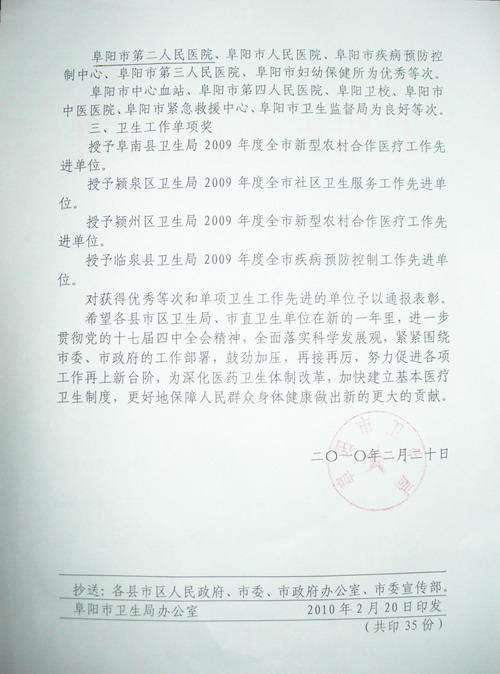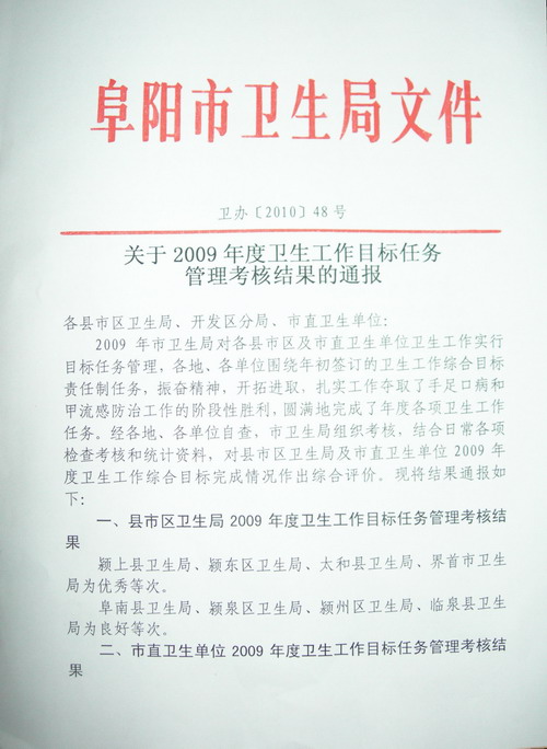 2009年,阜阳市第二人民医院坚持以邓小平理论、“三个代表”重要思想和科学发展观为指导,认真贯彻落实十七届三中、四中全会精神,深入推进医疗质量万里行活动和医疗安全百日专项检查暨平安医院创建等活动,坚持以病人为中心,把社会效益放在第一位,着力提高医疗质量,保障医疗安全,强化管理,争创一流,推进了全院各项工作快速协调发展。