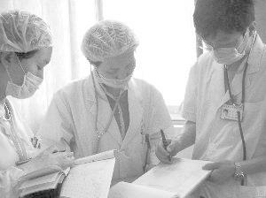刘晓琳(中)正与同事们研究诊治手足口病方案