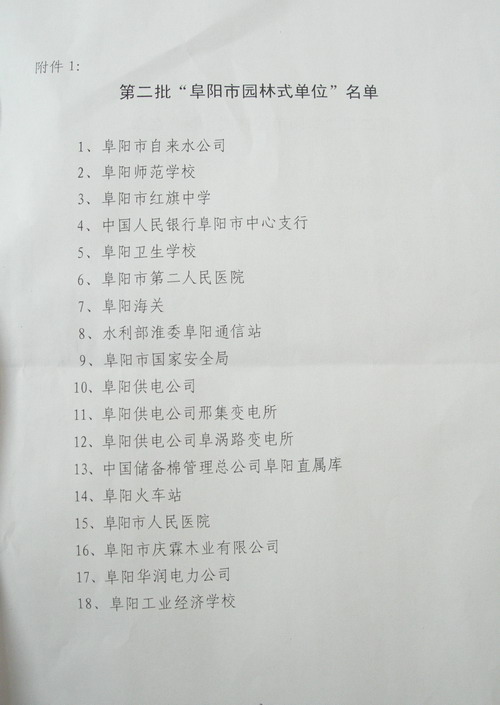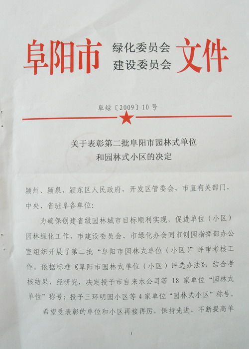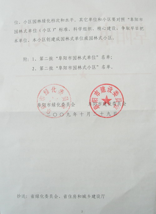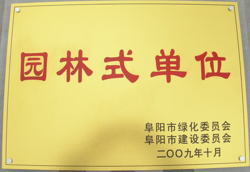 2009年10月30日,阜阳市第二人民医院被表彰为阜阳市园林式单位。