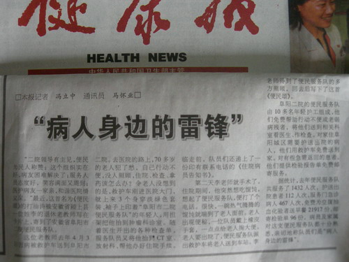 老汉从住院到出院,对便民服务队真是打心底太感激了。其实,他们的服务何止这些:每天要用担架、轮椅、推车等免费为许多行动不便或老弱病残者,在院内送到相关科室看医生、做检查、再送到相应的病区去住院,他们随时要做大型设备检查,也大都由服务队人员来接送。对家住阜阳城区需要护送出院的病人,他们则用救护车免费安全地把病人送到家。对每天早上来院抽血化验的空腹门诊病人,服务队人员还免向他们免费送上一份早点,并为急需返回的患者,提供检验报告单的免费邮寄服务。只要病人“有求”,他们则“必应”。哪里有病人的需要,哪里就有他们用担架抬病人、用轮椅推病人、甚至用肩背病人、用手扶病人、用救护车送病人出院、转院,为病人读报或为其交费、取药的身影……。