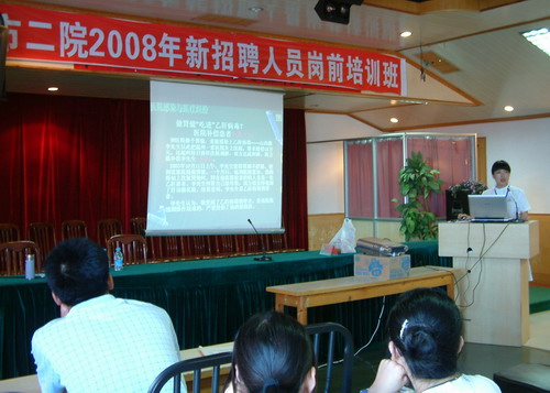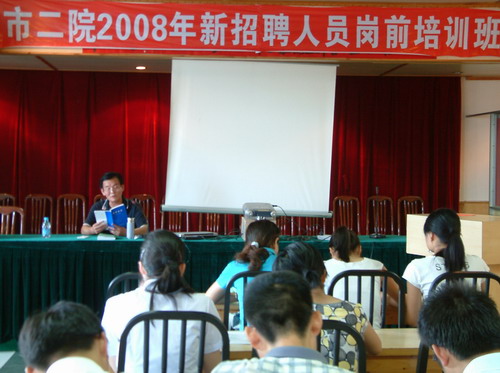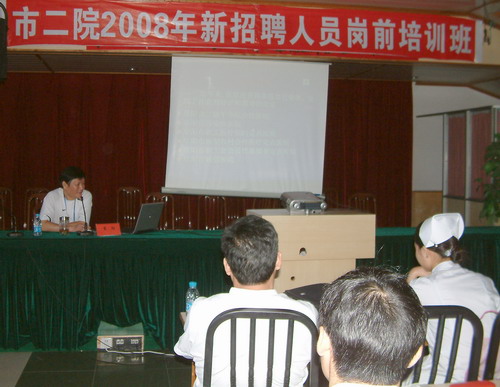 在为期一周的培训中,院长葛阳介绍了阜阳市二院近两年的快速发展情况和发展远景 ; 院纪委书记黄春民、副院长冉献贵和市卫生局医疗事故鉴定办公室主任邱书华,分别作了《医德医风与廉洁行医》、《怎样做一名合格的医务工作者》、《医疗风险与医疗安全》讲座,院办公室主任段云鹏、医务科长孟晓林、护理部主任祖大玲、感染办主任周晓平、科教科长韩明锋、预防保健科长李秀勇、药剂科长邓伟、保卫科邹鸣等分别对新同事进行了院规院纪、安全生产、医疗核心制度、护理程序及操作、医院感染与监测、医学论文撰写与文献检索、病历书写规范、传染病报告的填写、处方管理、消防安全等方面的培训。