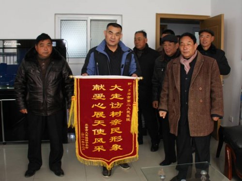 12月22日,界首市大黄镇筛子李村“两委”向阜阳市第二人民医院党委赠送锦旗,以达谢意。 2011年9月份以来,阜阳市第二人民医院党委认真贯彻胡锦涛总书记“七一”重要讲话精神,主动深入基层,开展“五级书记带头大走访”活动,9月29日、10月26日、11月2日,院党委书记刘新刚、纪委书记黄春民等一行多次来到大走访活动联系点——界首市大黄镇筛子李村,与全村党员和群众代表进行座谈,帮助“村两委”解决实际问题,向该村室捐赠了4套办公桌椅、一台32寸液晶彩色电视机,帮助他们改善办公条件,学习党的富民政策和致富技术。同时,还将对一些军烈属、困难户进行春节慰问和结对帮扶。(马怀业/文浦启伟/摄) |