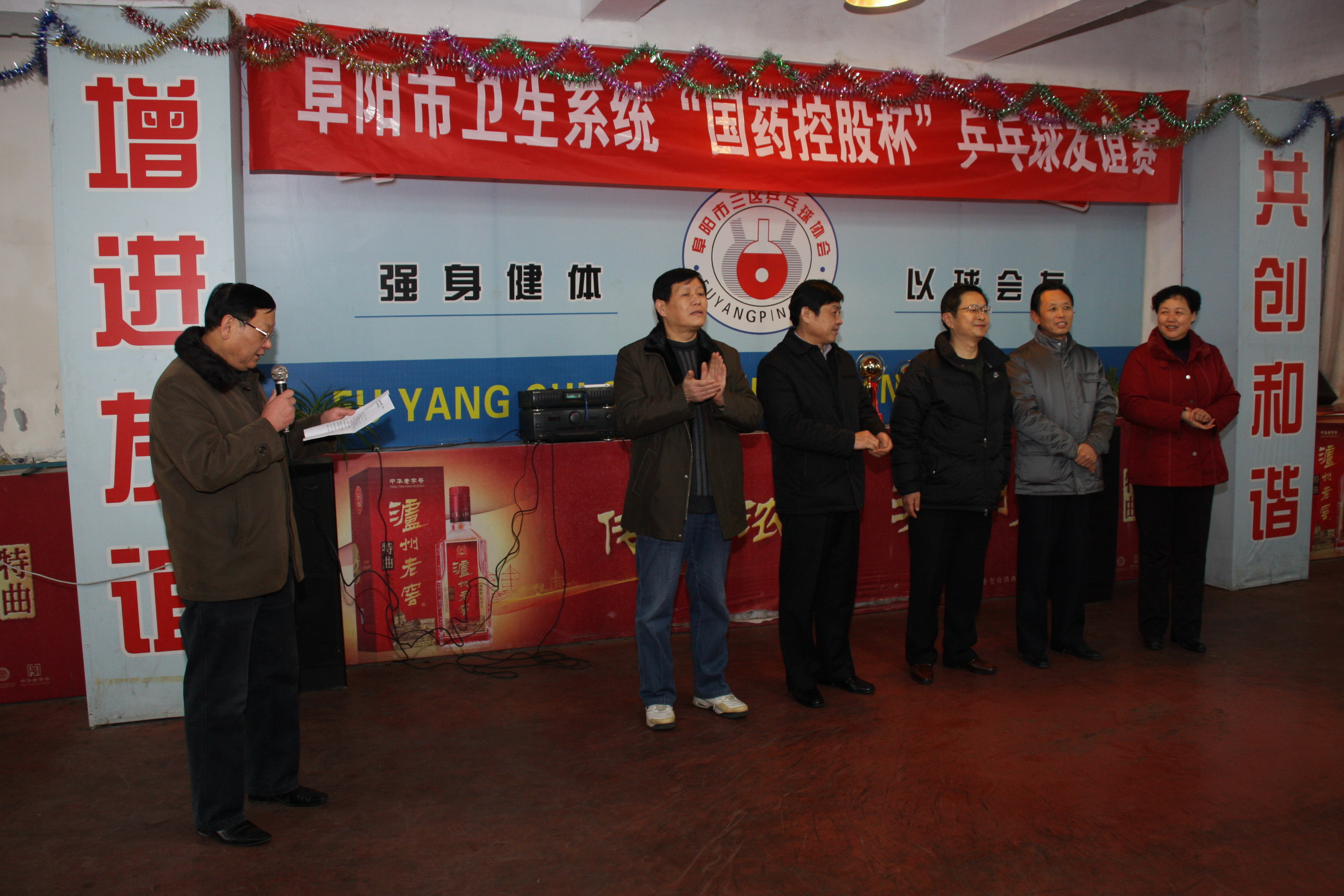 为推动《全民健身纲要》进一步实施,推进卫生系统乒乓球运动的广泛开展,促进全民健身运动,全市卫生系统联合举办了“国药控股杯”乒乓球友谊赛。此次活动由阜阳市卫生局主办,阜阳市第二人民医院具体承办,12月24日上午8时,友谊赛在阜阳市三区乒协拉开帷幕,市政协副主席、市总工会主席张友谊,市卫生局局长吴荣涛、副局长严伟、纪检组长陈丽华,市二院院长葛阳、副院长陶立伟,国药控股阜阳分公司总经理李洪浩等领导出席开幕式。9时比赛开始,竞赛项目分为:女子单打、男子单打、男子团体,来自全市卫生系统18个单位代表队近百人参加了竞赛,运动员中年龄最大的60岁,最小的19岁。