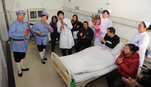 2012.1.5《阜阳日报》一版 本报记者 马红云/文 戴斐/摄 “五彩云霞空中飘,天上飞来金丝鸟……红军是咱们的亲兄弟,长征不怕路途遥……”1月4日,阜阳市第二人民医院质控办主任李玉华等三人走进该院肝三科病房,将一首葫芦丝伴奏的红歌《情深意长》送给住院病人,向他们表示新春的祝福。 当天,该院举办职工迎新春联欢会,该院医护人员唱起祝福的歌曲,跳起欢快的舞蹈,共庆新年。主会场外,表演人员自发组成文艺小分队,带妆走进病房,为住院病人送上精彩的文艺节目,向住院病人送去了浓浓暖意。 李玉华等人带着自编自演的节目来到肝三科13病室,在住院病人邵恒志的病床前开演。李玉华吹起葫芦丝,另外两人穿着红军服装深情演唱,病房顿时变成了欢乐的海洋,邵恒志和病友们乐得不停鼓掌。 “高兴,真高兴,没想到在病房里能看到精彩节目,医护人员很用心。”来自利辛县的邵恒志乐呵呵地说。 |