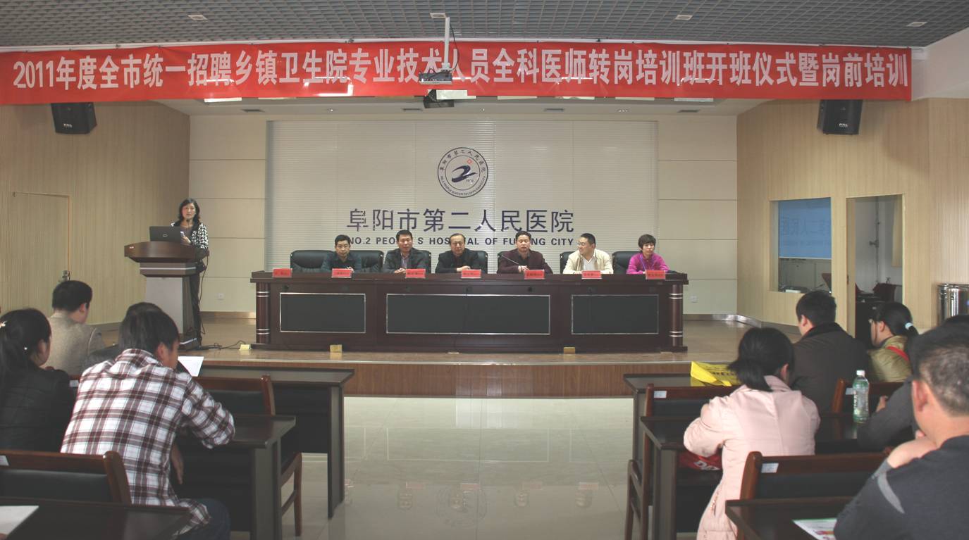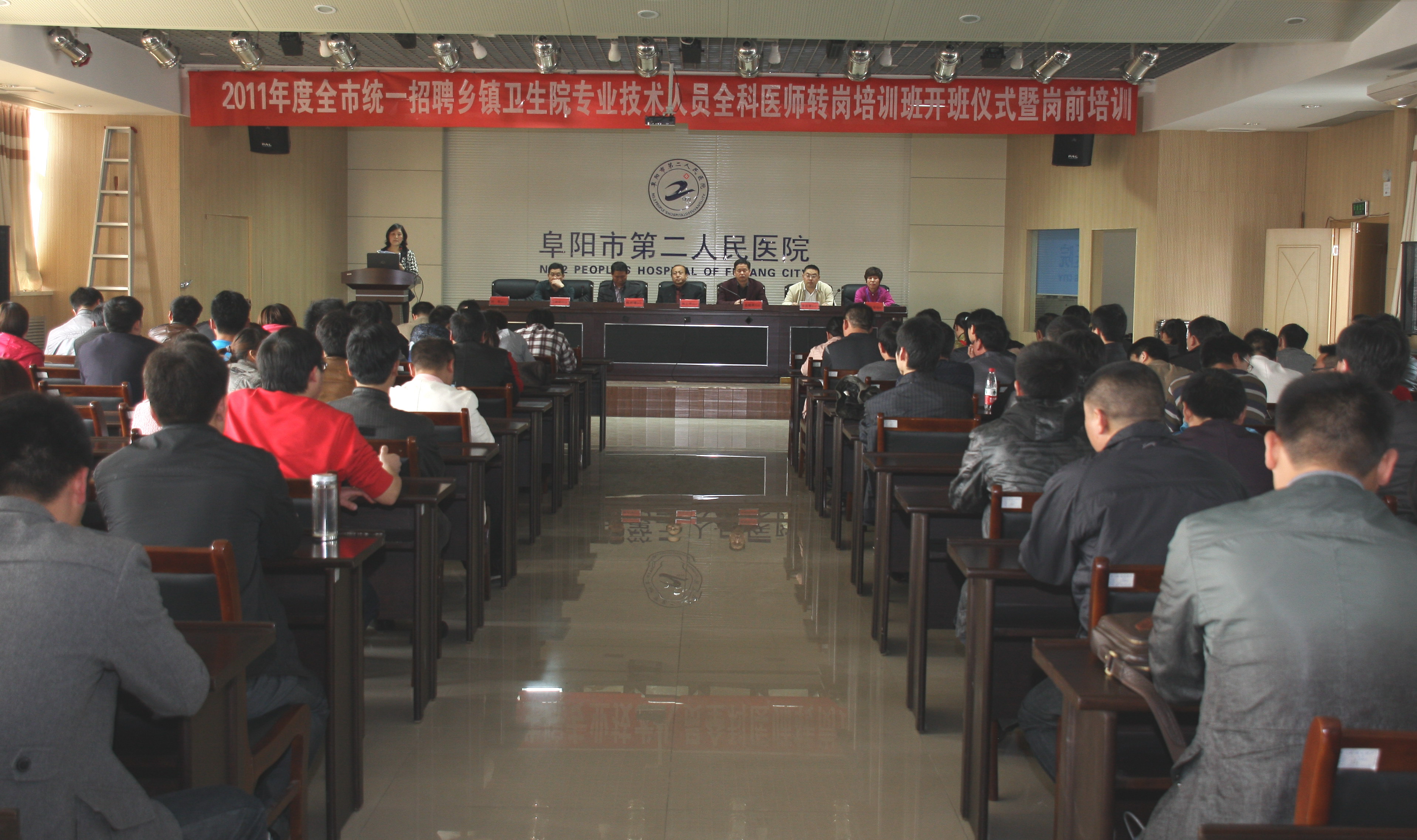 4月5日,由市卫生局、市人事局2011年度统一招聘的114名乡镇卫生院全科医生转岗/岗位培训工作开班仪式在阜阳市第二人民医院隆重举行。阜阳市第二人民医院陶立伟副院长,科教科韩明锋科长、刘军和艾继超副科长,医务科孟晓琳科长、李秀勇副科长和图书管理室李玉华主任参加了开班仪式。