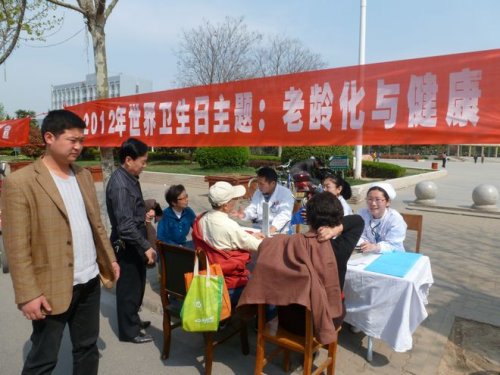 每年的4月7日是世界卫生日。今年当日上午,阜阳市第二人民医院组织医务人员到清河广场开展了义诊宣传活动。 今年世界卫生日的主题是:老龄化与健康,口号是:“健康相伴,活力常在”。活动现场吸引了100多位老人前来咨询、义诊,医务人员亲切地为他们耐心地讲解、答疑,作相关健康检查、指导,并发放宣传材料,收到良好的效果。阜阳市医学会、市医学会老年分会及市医院也参加了此次活动。