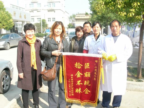 “出院时把 钱包 弄丢了,本来以为找回无望了,没想到遇上好心人。真是 太感谢你们了!”“看病都是给亲戚借的钱,要不然我真不知该怎么办? ” 11 月 1 日上午,临泉县谢集镇陈新行政村刘庄陈先生双手紧紧地握着阜阳市第二人民医院洗衣房洗洁工高汝才的手感激地说,并在鞭炮声中将一面题着“拾金不昧、巨额现金”的锦旗交给高汝才,以感谢他拾金不昧的高尚品质。