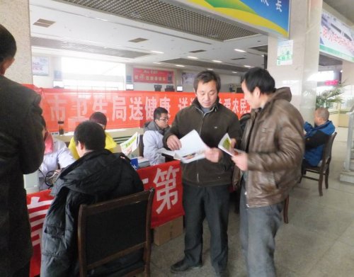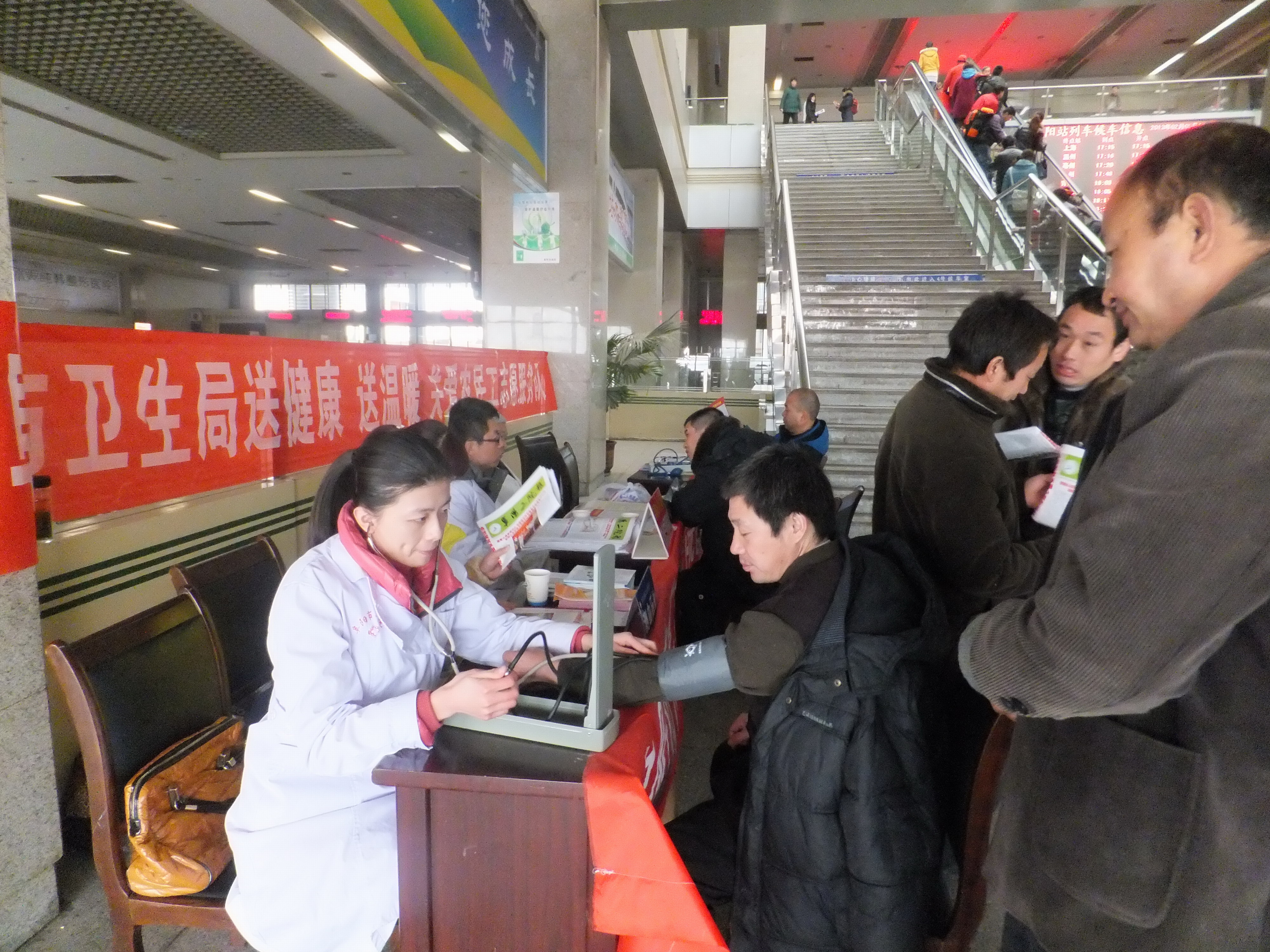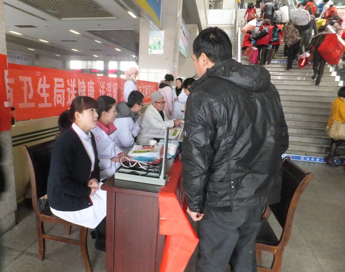 2 月 5 日 ,阜阳市二院组织心血管内科副主任医师卫乃恒、普外科主治医师孙振阳,护士张瑞、李韦等医务人员 到火车站开展春运期间关爱农民工志愿服务活动。 为进一步贯彻落实党的十八大精神,按照阜阳市文明办《关于在 2013 年春运期间深入开展关爱农民工志愿服务活动的通知》的文件精神, 春运期间,市卫生局组织所属市第二人民医院等 10 家单位的医务工作志愿者,到阜阳火车北站开展送健康、送温暖、关爱农民工免费义诊的志愿服务活动,为在春运客流高峰期间农民工的身体健康提供保障。 活动期间,市第二人民医院志愿者们深入火车站,为返乡的农民工朋友免费提供近 20 种常用药品和 10 余种健康宣传资料,为等待回家过年的旅客进行义诊、健康宣教,并诊治感冒、发烧、腹泻、晕车等问题。 在嘈杂的环境、拥挤的人群中,尽管每名志愿者忙得连水都顾不上喝,但他们仍坚持微笑着为旅客提供最为优质的服务,受到返乡农民工朋友和社会各界的一致好评。 在春运期间开展本次活动,让农民工深刻体会党的关爱,同时,也使参加志愿服务的党员受到深刻的教育。 (马怀业 / 文 庞利 / 摄) |