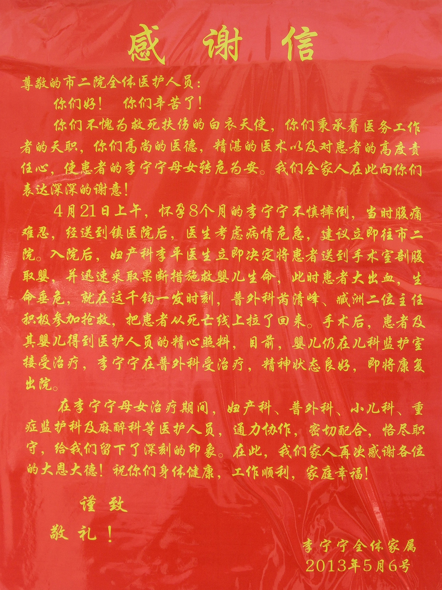 匾额赞二院妙手回春 医者仁心 5 月 6 日 上午,患者李某家属抬着匾额,手拿感谢信来到二院,感谢医护人员挽救了他们家的 2 个生命。 4 月 2 1 日 上午,已怀孕 8 个多月的患者李某在家不慎摔倒,腹痛难忍、晕厥、血压不稳,被家人紧急送往当地卫生院,经医生检查后发现该患者病情危重,建议送上级医院就诊。家人立即将李某送到市二院,妇产科主治医师李平接诊后,发现患者李某血压不稳,难免性先兆流产,立即行急诊剖腹产手术抢救 母 婴,术中发现患者内脏受损,腹部大出血不止,血压由不稳到测不到,婴儿虽经剖宫取出,但李某生垂危,立即请来 血管外科副主任芮清峰和 普外科副 主任、主任医师臧洲继续行急诊修补止血手术,及时给患者行填塞压迫止血法,输血补液,清除腹腔内血液及凝块,查找并堵塞出血部位,结扎胃网膜血管和胃后壁血管,并行脾切(伴脾门部大出血),在手术室、麻醉科 等多学科的 通力 协助下 ,李某手术及时而顺利。随之, 先后转入重症医学科、普外科进行后续治疗,不足月的婴儿在也新生儿室的治疗呵护下,平安康复,日前即将康复出院。“是你们挽救了我们家的 2 个生命!”出于感激,李某家属前来感谢不尽。 |
