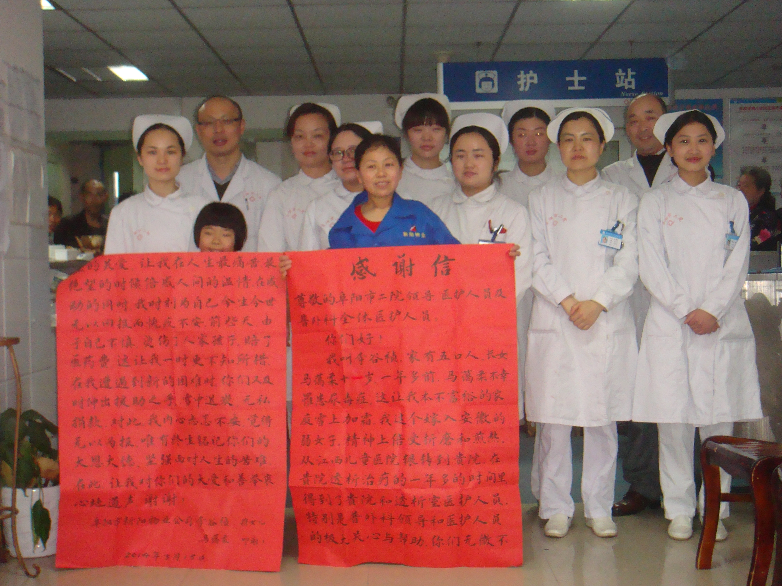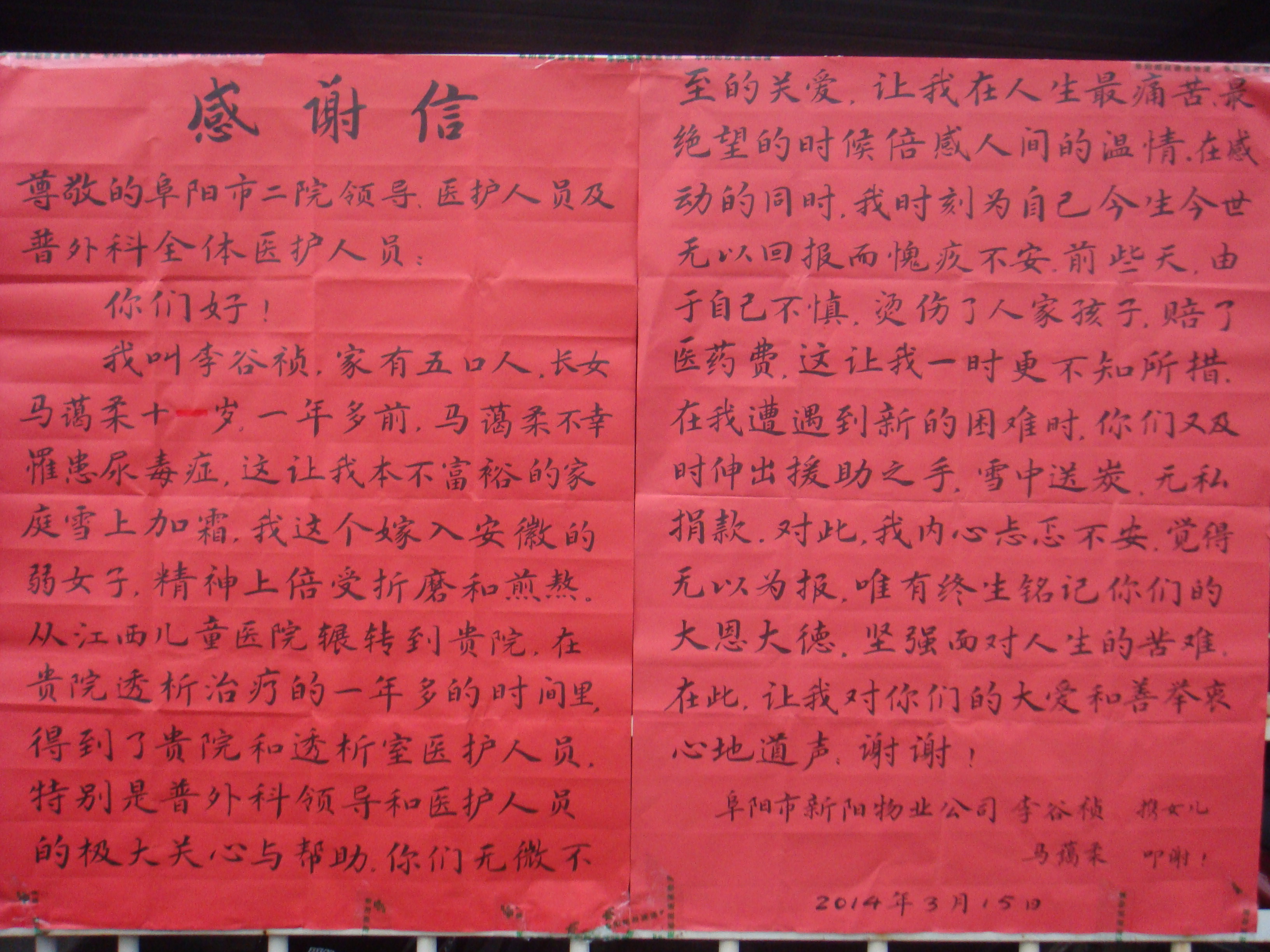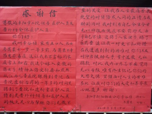 李谷祯娘家在江西,嫁到阜阳,生有一男一女,大女儿现年11岁,于2012年患尿毒症在我院透析室长期透析,以维持生命,其公爹年迈患有肠梗阻,生活不能自理,丈夫因要照顾3岁年幼的儿子和年迈多病的父亲,不能长年外出打工,在家临时做泥瓦工,靠微薄的收入养家糊口。李谷祯为照顾长期透析的女儿,在市二院普外科做临时保洁工,每月几百元收入,去除房租等勉强维持生活,补贴家用。可祸不单行,一万元赔偿金需要扣除她一年多的工资,扣除工资后的李谷祯生活陷入困顿 ……