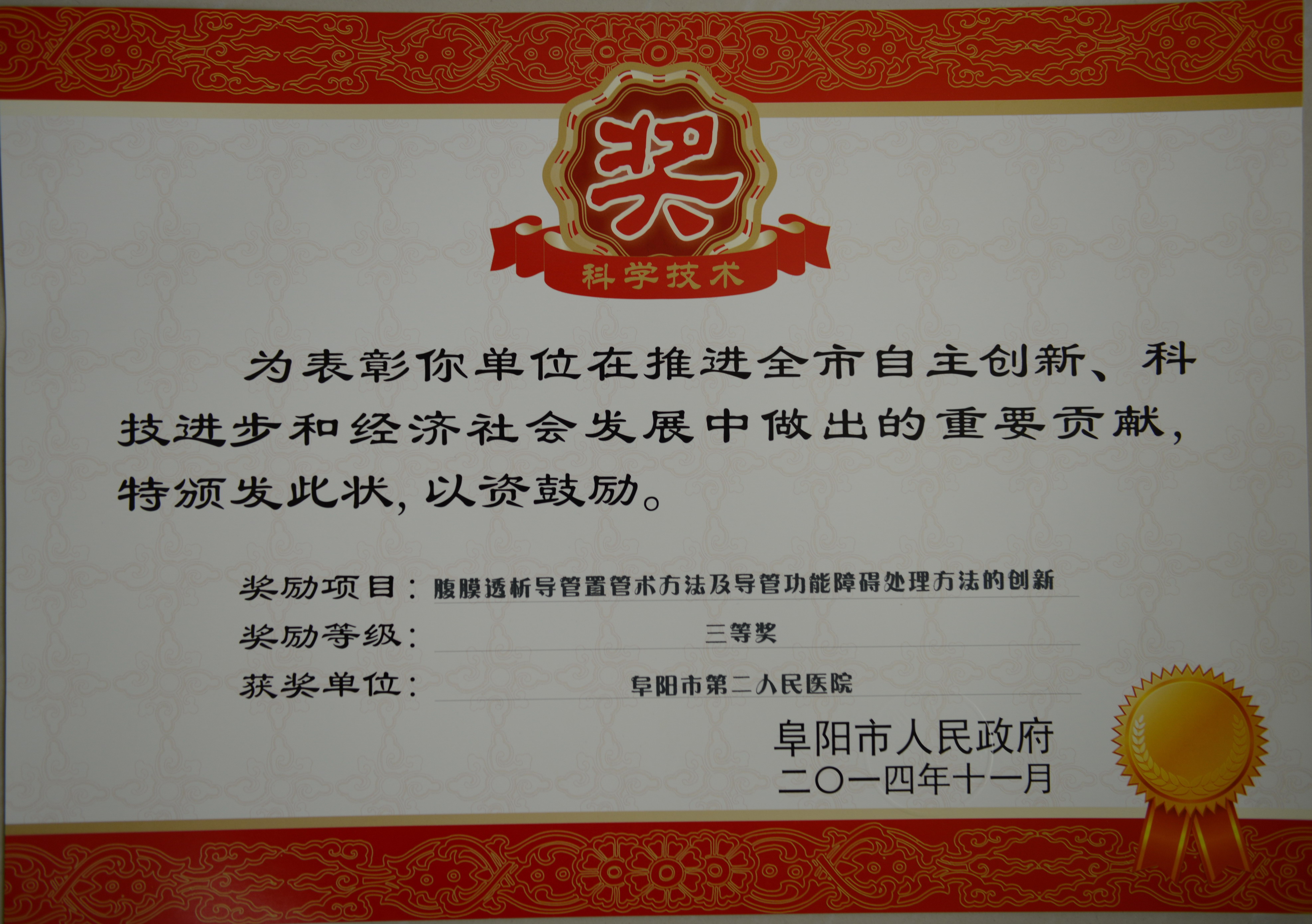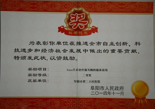 2014年11月27日,从阜阳市科学技术奖励大会上传来喜讯,阜阳市第二人民医院荣获四项2014度市级科学技术进步奖,其中二等奖三项,三等奖一项。 荣获二等奖的三个科研项目分别是:布加综合征合并下腔静脉血栓的综合治疗,完成人员是阜阳市第二人民医院普外科:芮清峰、孙振阳、刘允乐、臧洲、罗大勇、梁军、孙海云、孙强;Nuss手术治疗漏斗胸的临床应用,完成人员是阜阳市第二人民医院胸心外科和麻醉科顾江魁、陶立伟、葛阳、曹冠亚、张忠义、孙涛、陈春雨、丁力;经皮肾穿刺活检术临床应用模式的研究,完成人员是阜阳市第二人民医院超声科和肾病科胡冬梅、王建、李庆士、李龙海、付海蓉、李睿、孙静静、李振军。 荣获三等奖的科研项目是:腹膜透析导管置管术方法及导管功能障碍处理方法的创新,完成人员是阜阳市第二人民医院肾病科:李龙海、梁桂芳、孙静静、李庆士、姜传学、李振军。 |
