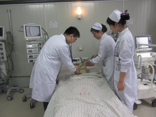 根据应急演练方案,以急诊科为模拟演练现场,对呼吸机发生故障进行现场调配。演练现场,急诊科有一例呼吸衰竭的危重患者,呼吸机突发故障报警。急诊科李莉莉副护士长立即断开呼吸机管路,为患者进行人工简易机械通气,同时安排赵圆圆护士报告科主任及值班医师。鲍华西主任安排李鹏涛医师为病患检查身体,同时电话汇报设备科。