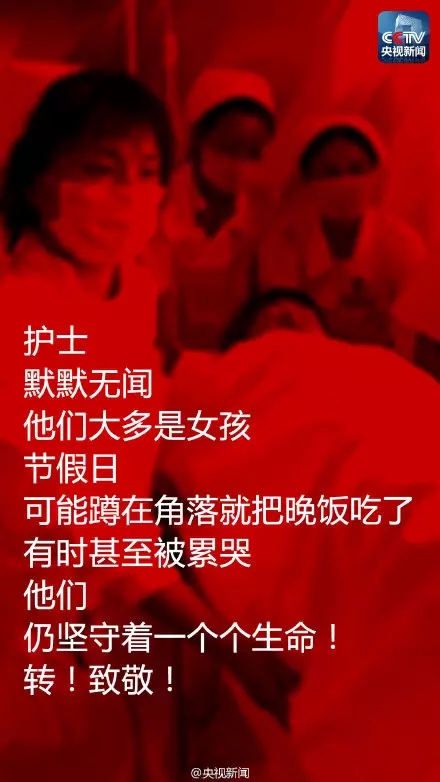 病人身无分文,护士易进华出钱给他买止疼药;凌晨,病人试图跳楼,她和同事赶上前抓住他,40分钟不敢松手…护士,默默无闻,有时要照顾数十病人,他们大多是女孩,节假日,可能蹲在角落就把晚饭吃了,有时甚至被累哭。。。。。。