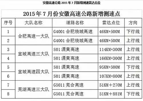 安徽省高速公路新增8处雷达测速设备,将于8月10日启用。分布在合肥绕城高速、溧黄高速和芜合高速。