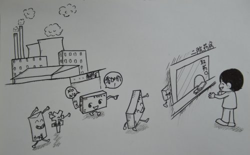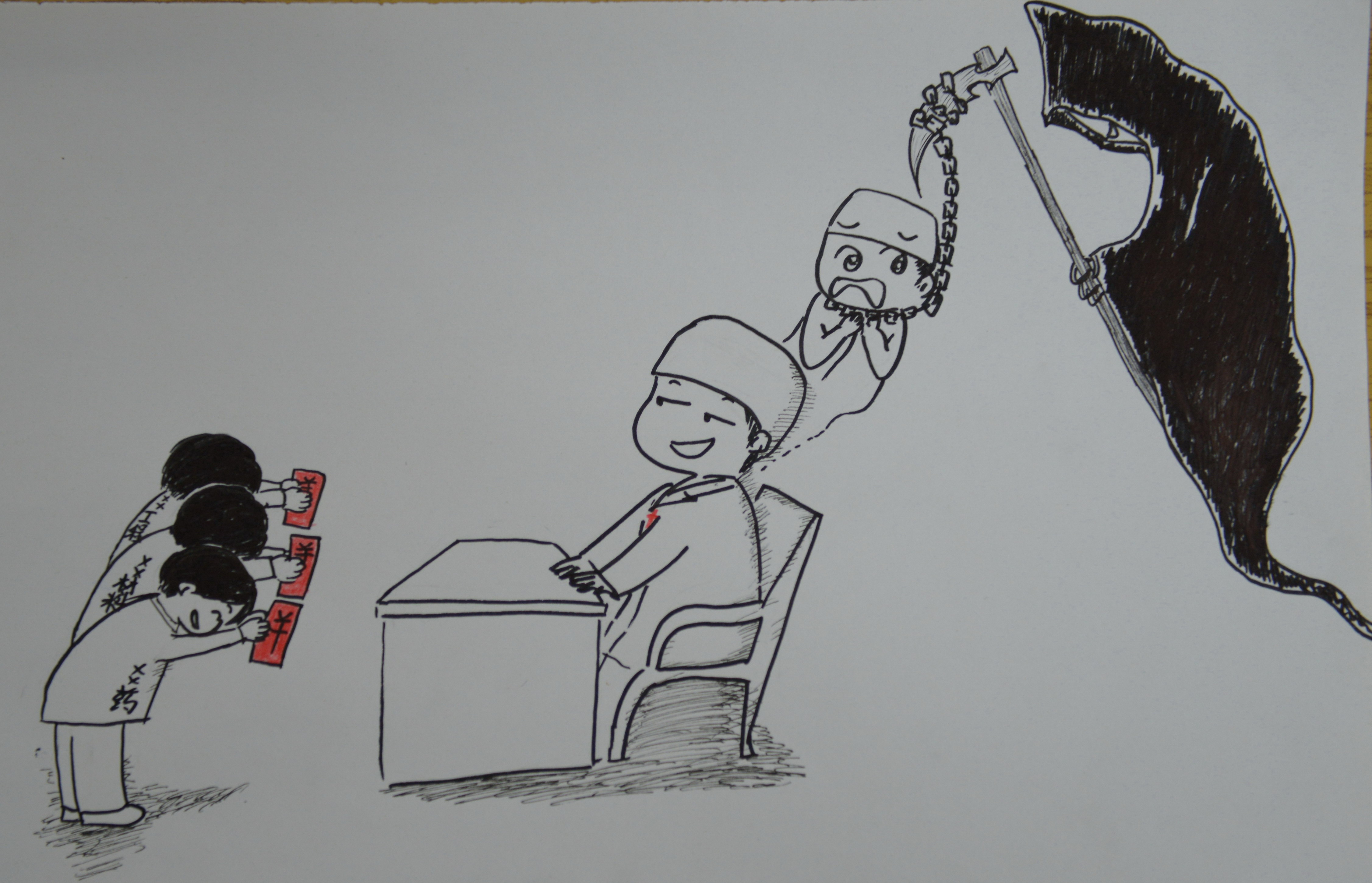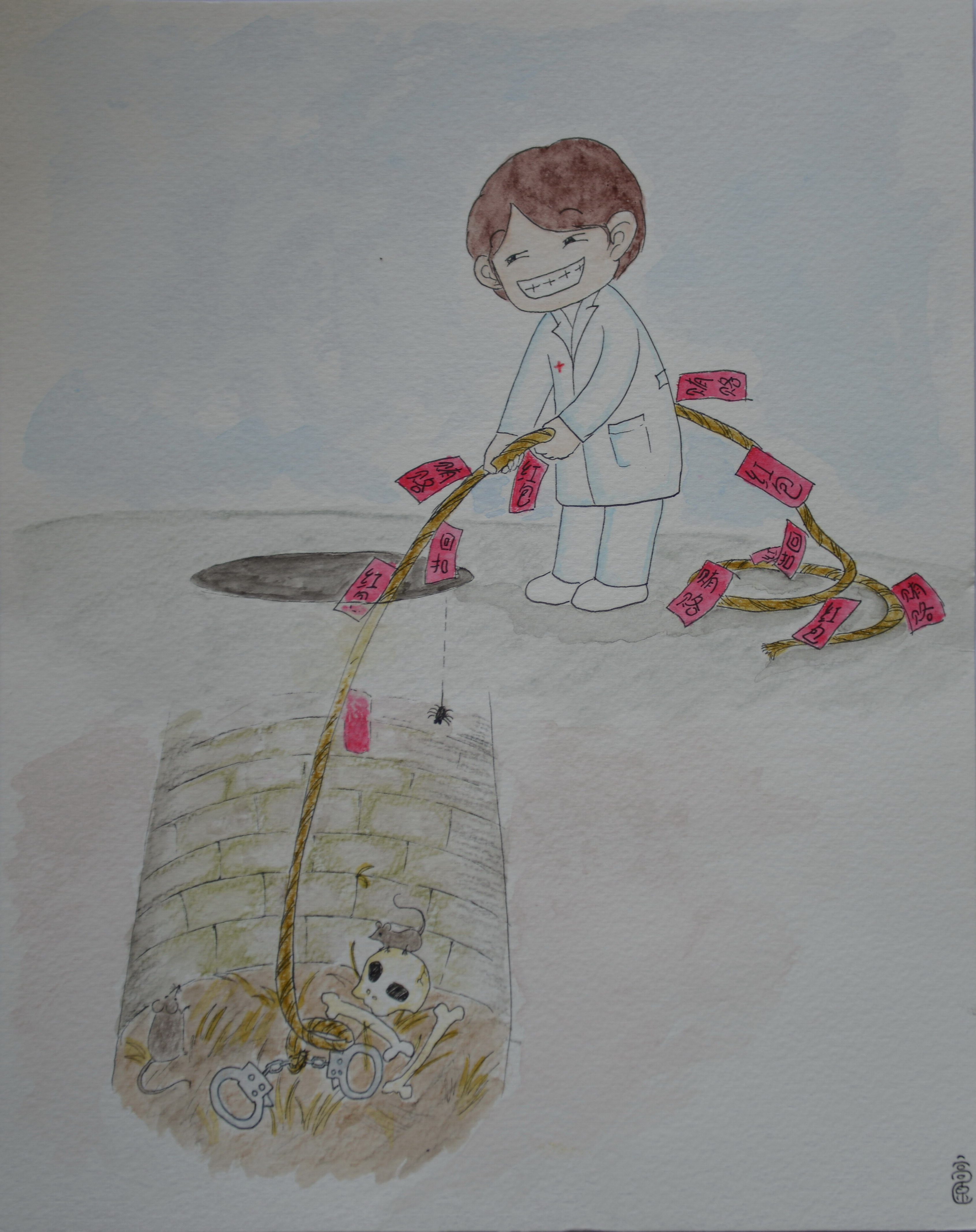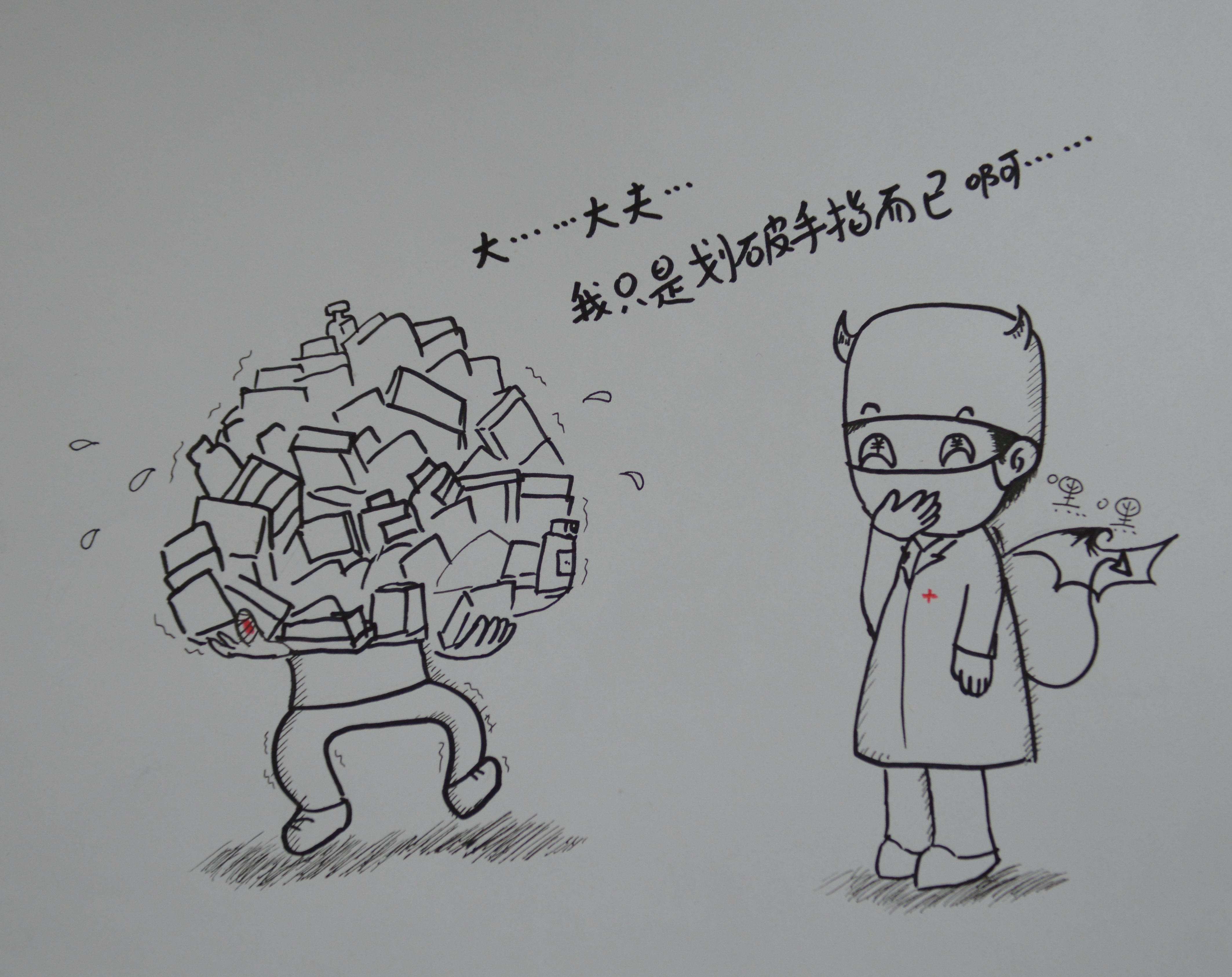 作品注释:对待病人,开不必要的大处方,让病人伤财,也让白衣天使的形象变成病人心目中满眼是钱的魔鬼的形象。