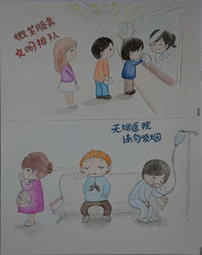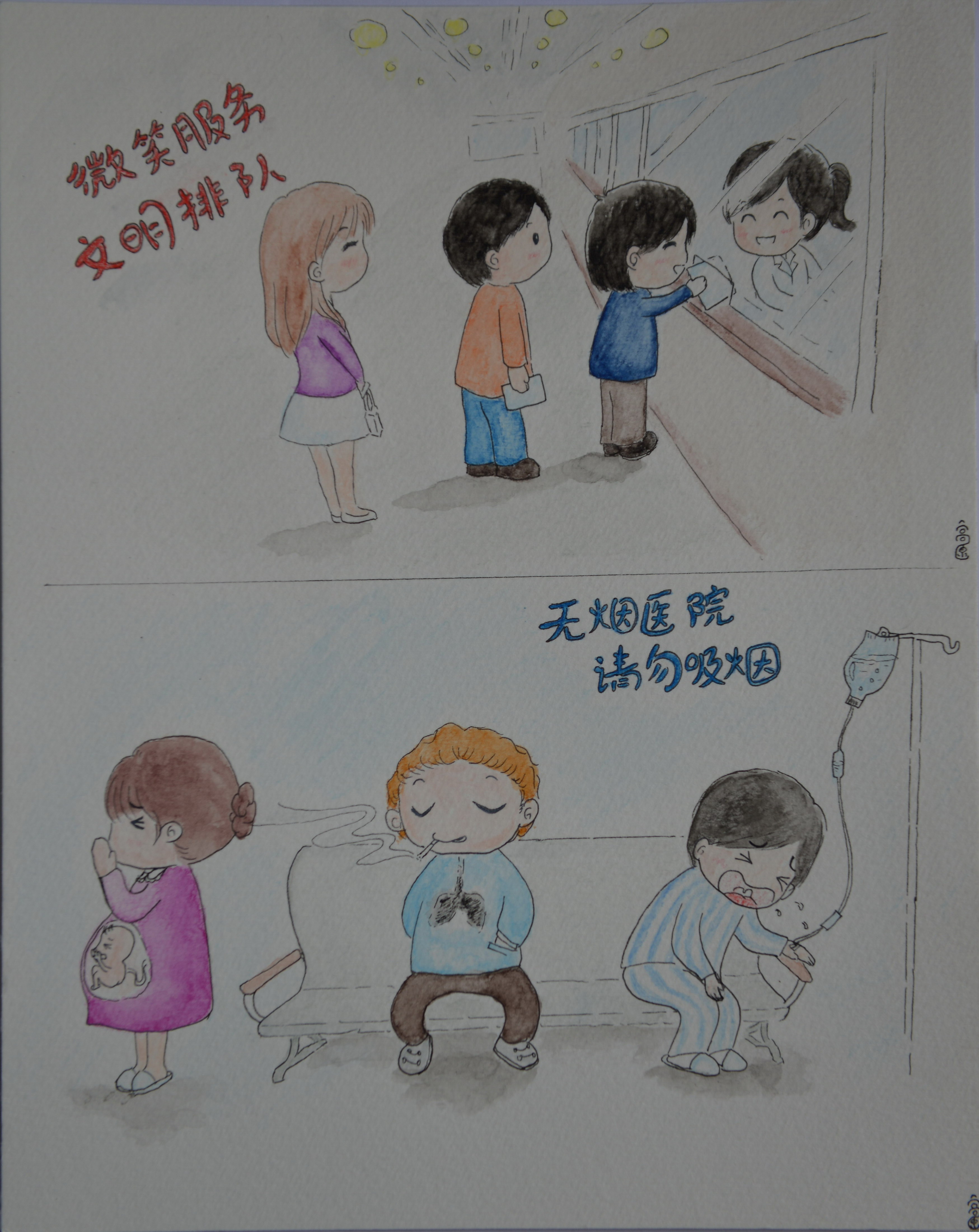 作品注释:微笑服务,文明排队;无烟医院,关爱他人……都是阜阳市第二人民医院—安徽省文明单位的真实写照。