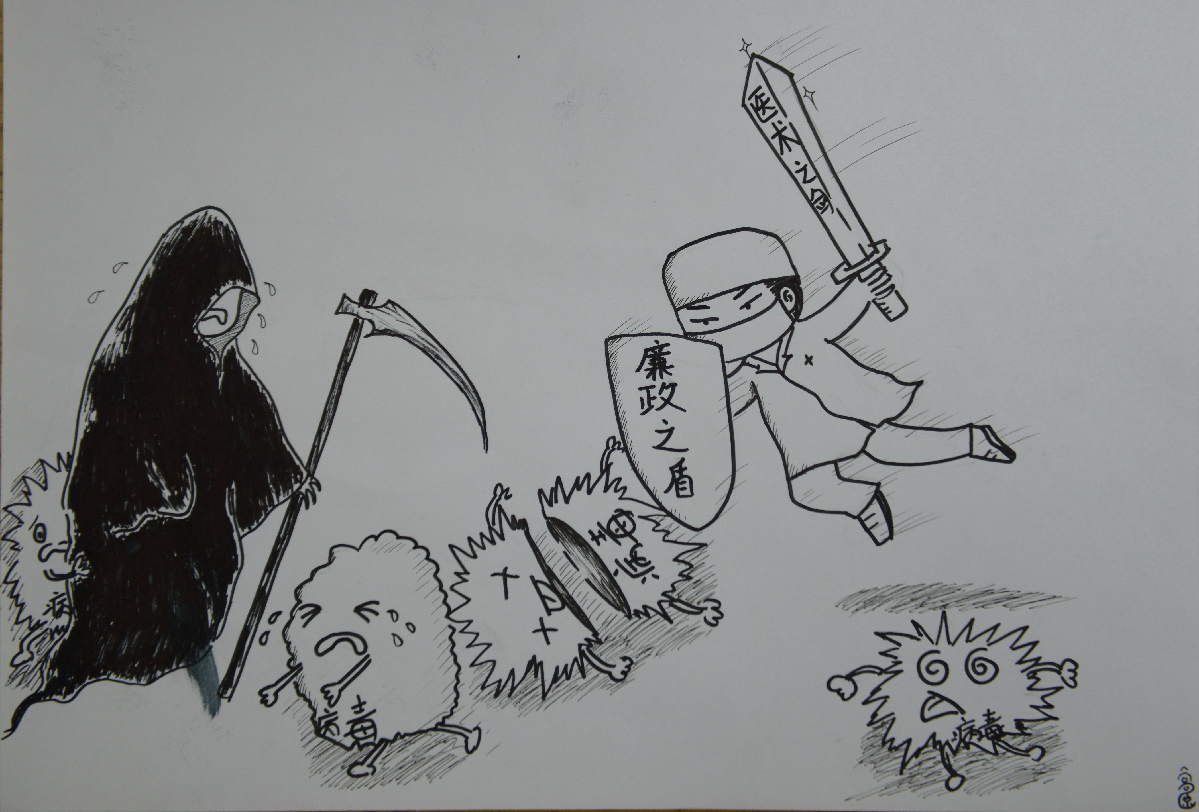 作品注释:有了清廉,医院才有健康规范的医疗环境,有了医术,才能够帮助病人更好的抗击病魔。清廉做盾,医术做剑,是帮助病人摆脱病魔的利刃武器。