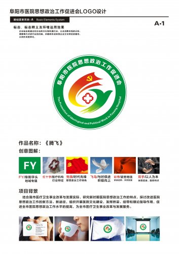 为广泛宣阜阳市医院思想政治工作促进会的活动,便于联系与交流,阜阳市医院思想政治工作促进会于2016年1月下发了《关于开展阜阳市医院思想政治工作促进会标识(LOGO)有奖征集活动的通知》,得到各理事单位及成员,以及社会有关专长人员的响应。截止2016年2月,学会共收到本会有关理事会成员和专业设计人员等11个单位或个人提交的近20幅创作图案,经2016年4月18日秘书长扩大会议组织初评,在学会网站进行公示,以及2016年5月18日2016年第一次会长扩大会议(常务理事会)最终审定,正式启用阜阳市医院思想政治工作促进会会徽(IOGO)。 该会徽名称《腾飞》,由北京市昌平区设计师沈志高同志创作,其设计理念紧扣本会宗旨,即结合我市医疗卫生事业改革与发展的实际,研究新时期医院思想政治工作的特点,探讨改进医院思想政治工作的新方法、新途径,组织开展医院文化建设,发挥桥梁、纽带和理论指导作用,促进全市医院思想政治工作水平的提高,为全市医疗卫生事业改革与发展服务。图案外围为中英文“阜阳市医院思想政治工作促进会”,主要设计蓝图由三部分组成,分别为阜阳的拼音字头“F”、“Y”和医疗十字。线条有机地融合了舞动的彩带、互握的双手、医疗十字、飞鸟,以及迎风飘展的党旗和熠熠生辉的党徽等元素,既表现了阜阳的地域特色和专属性,又表达了医疗机构、中国共产党、思想政治工作、促进等内涵。舞动的彩带、互握的双手象征着本会的桥梁和纽带作用,体现了本会能够增强和促进全市医疗机构的凝聚力、向心力和团队精神,更好地为全市人民提供医疗服务,彰显了本会紧密相连、共同发展的宗旨。左边的字母F演绎而成一面面党旗,与下面的医疗十字相辉映,象征着各级医疗机构在各级党组织的领导和感召下,以医疗服务为核心,服务于人民健康。右边的字母Y演绎而成腾飞鸟,象征着本会在党的领导下,通过思想政治工作,促进阜阳市医疗事业如腾飞之鸟,不断开拓奋进,进一步表达了本会蒸蒸日上的发展前景和美好未来。 标志设计简洁大气,构思新颖,寓意贴切,时代感强,一目了然。