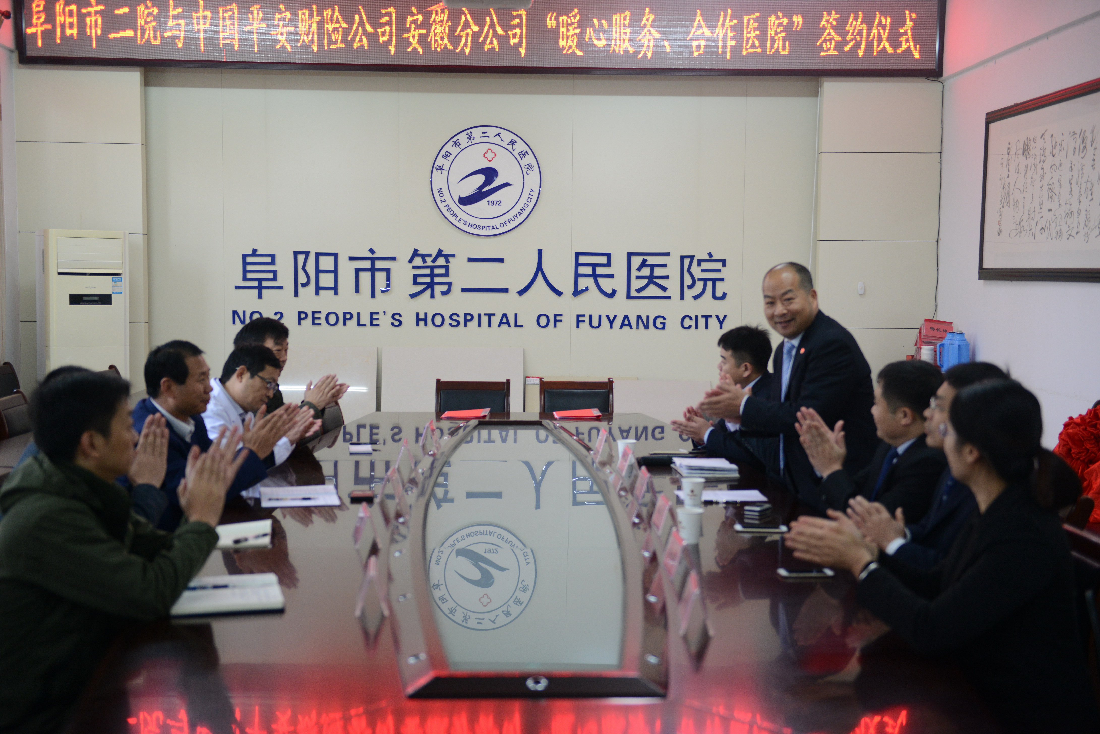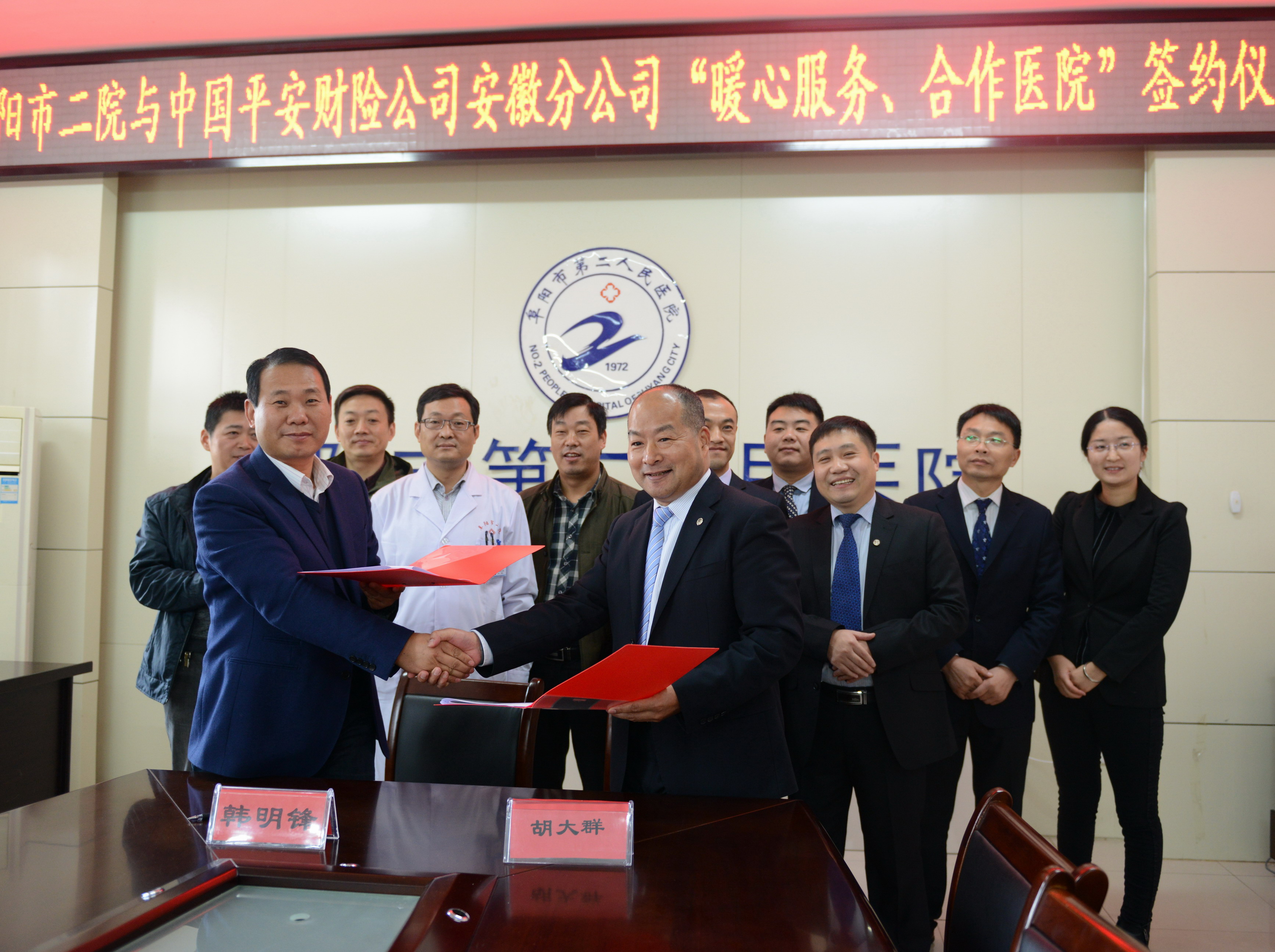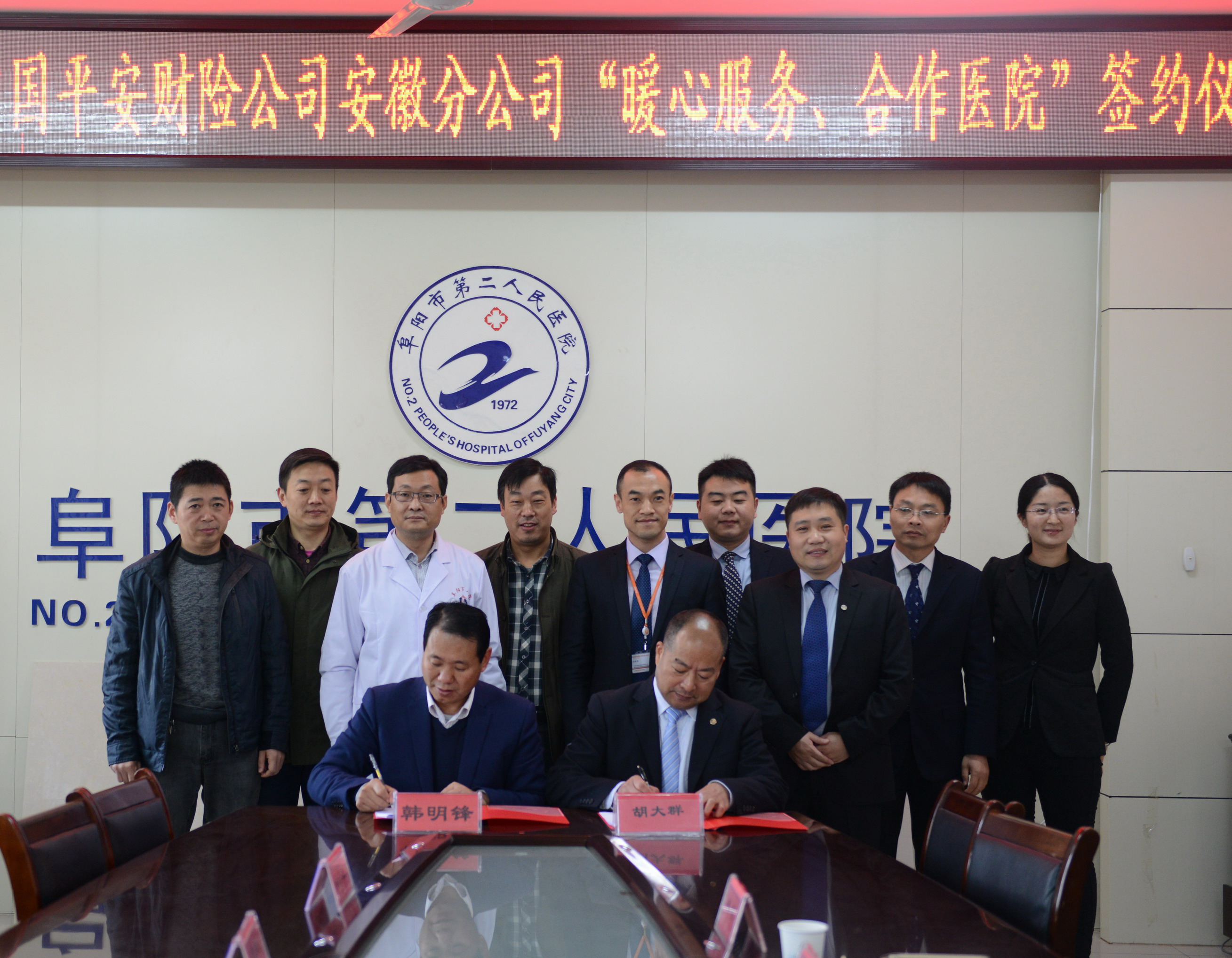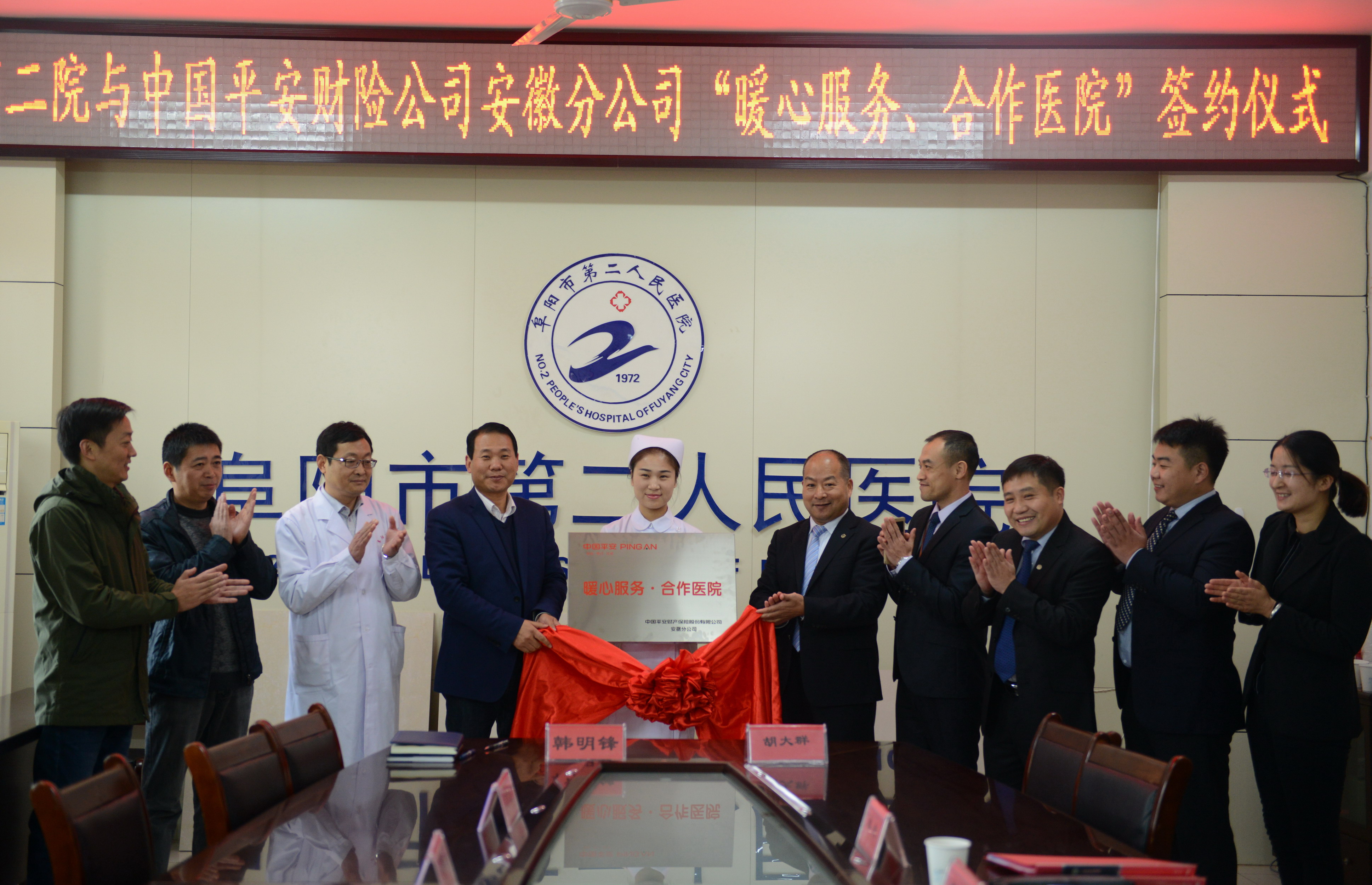 阜阳市二院副院长韩明锋、医务科、财务科、事业拓展办公室和骨科负责人,中国平安财险安徽阜阳分公司总经理胡大群,安徽分公司财险部主任汪怀舟,阜阳分公司车险部主任赵永,以及韦礼、李全中和李淑慧等业务主管参加了协议签署和揭牌仪式。