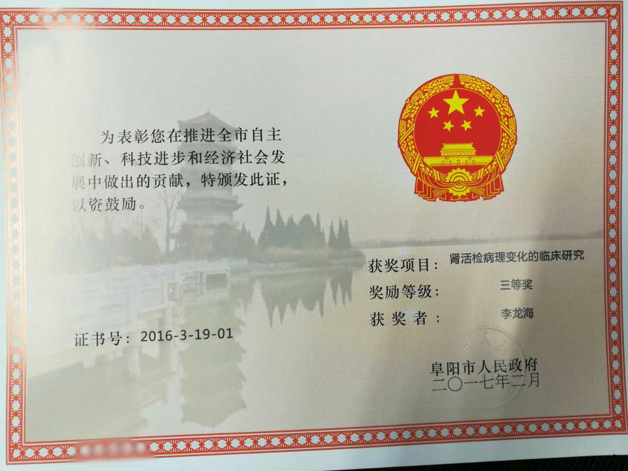 2017年2月24日,市委、市政府召开全市科技创新暨人才工作会议,会上对全市评出的2016年度阜阳市科学技术奖进行了表彰,其中阜阳市第二人民医院分别荣获奖二等奖、三等奖各一项。 根据《阜阳市人民政府关于2015—2016年度阜阳市科学技术奖励的决定》(阜政发〔2017〕11号)精神,会上,对2016年度评出51项阜阳市科学技术奖进行表彰和奖励,设特等奖1项,一等奖3项,二等奖22项,三等奖25项,其中由阜阳市第二人民医院周晓平、韩明锋、陶立伟、罗腾达、黄继峥、任阿可、刘丹梅、周彩凤等完成的《阜阳市基层医疗机构医院感染管理现状调查及干预卫生经济学研究》项目获得二等奖,由阜阳市第二人民医院李龙海、王建、李庆士、孙静静、李振军、吴振球等完成的《肾活检病理变化的临床研究》项目获得三等奖。 |