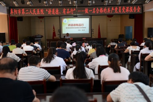 6月27日,阜阳市第二人民医院举办 “讲道德、有品行”,做一名合格共产党员党课报告会。院纪委书记管海新主持报告会,全院党员150余人参加。 陶立伟书记围绕共产党员如何坚守道德高线和纪律底线,作出一堂高屋建瓴、切中肯綮的党课。陶书记要求全院党员要不忘初心,在未来的工作生活中结合医疗行业“九不准”、“两学一做”,以及创建医德好、质量好、服务好“三好一满意”活动,积极投身医院的医药卫生综合体制改革中来,端正服务态度,加强党性修养,坚定理想信念,做一个“讲道德、有品行”医务人员。 |