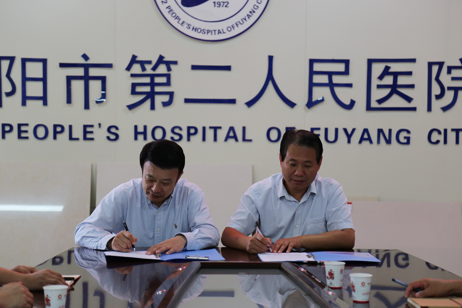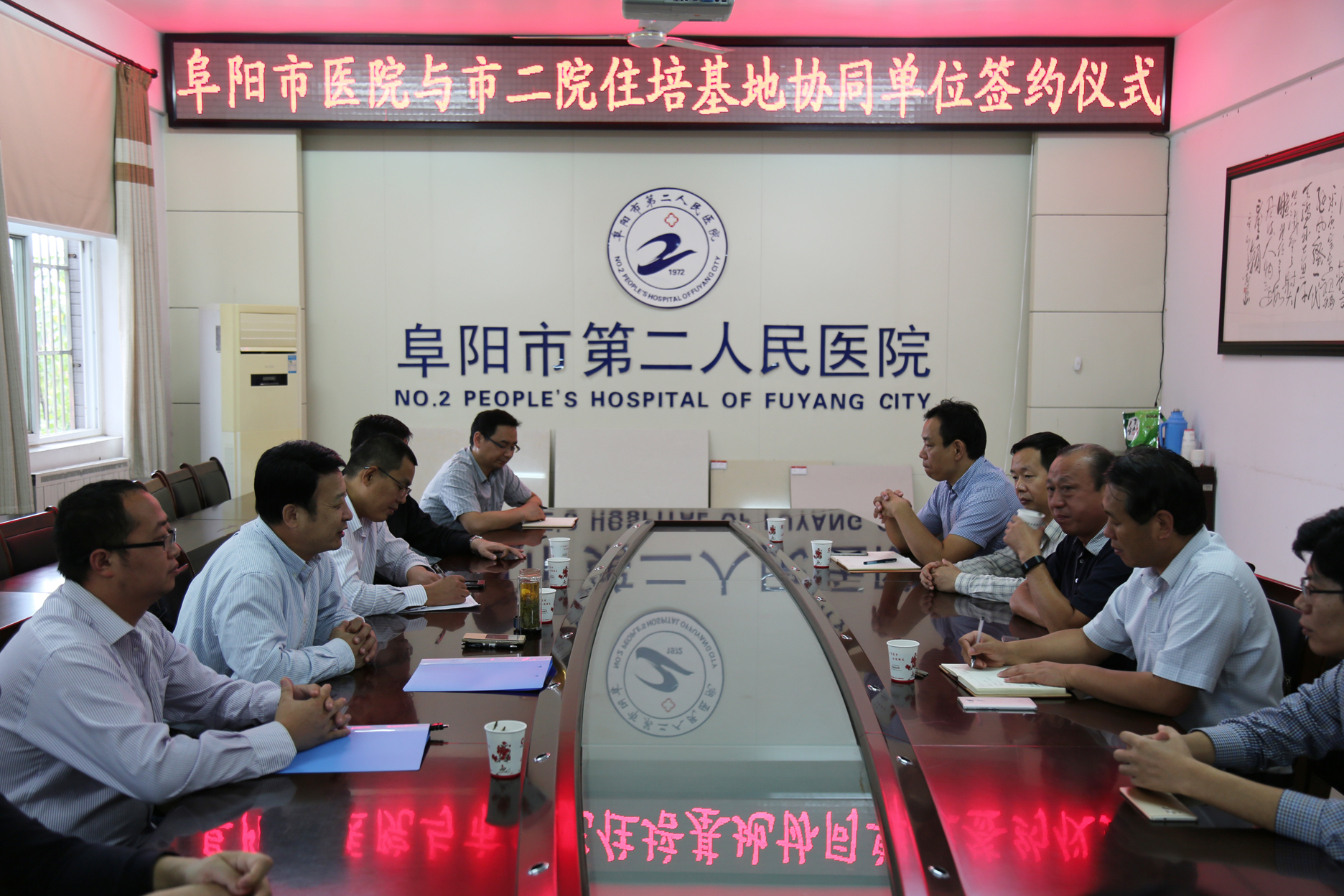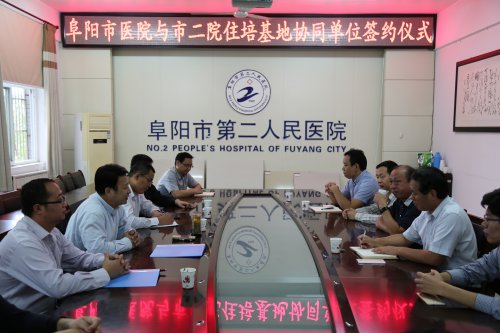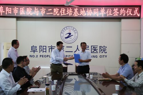 9月29日,阜阳市住院医师规范化培训临床基地医院阜阳市人民医院与市第二人民医院签署协议,由市第二人民医院协同市人民医院做好内科专业、全科专业的传染病科住院医师规范化培训工作。市人民医院副院长干阜生,市第二人民医院院长、党委副书记韩明锋,党委书记陶立伟等参加协议签署仪式。