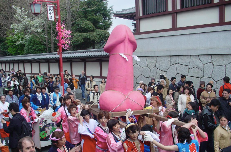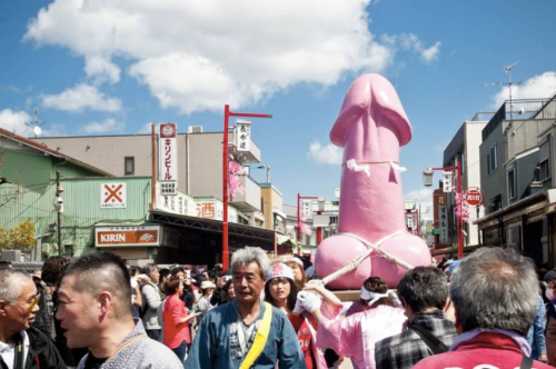 每年樱花盛开时节的四月第一个周日,日本神奈川县川崎市若宫八幡宫内的金山神社都会举行极具特色的生殖崇拜节——金魔罗节(“魔罗”在日语中意为男根)。