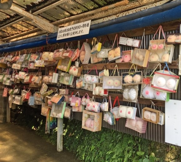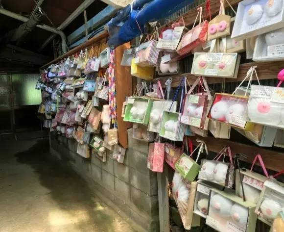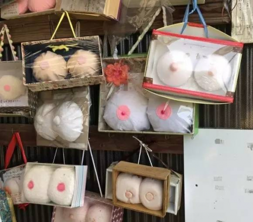 通过这条楼梯,上到大殿,就会看到一排许愿栏,来拜拜的人们将他们的祷告和愿望写在上面。通常神社里都是一块块的许愿板,但在这里,则变成了各式各样,一个个装着乳房的盒子。