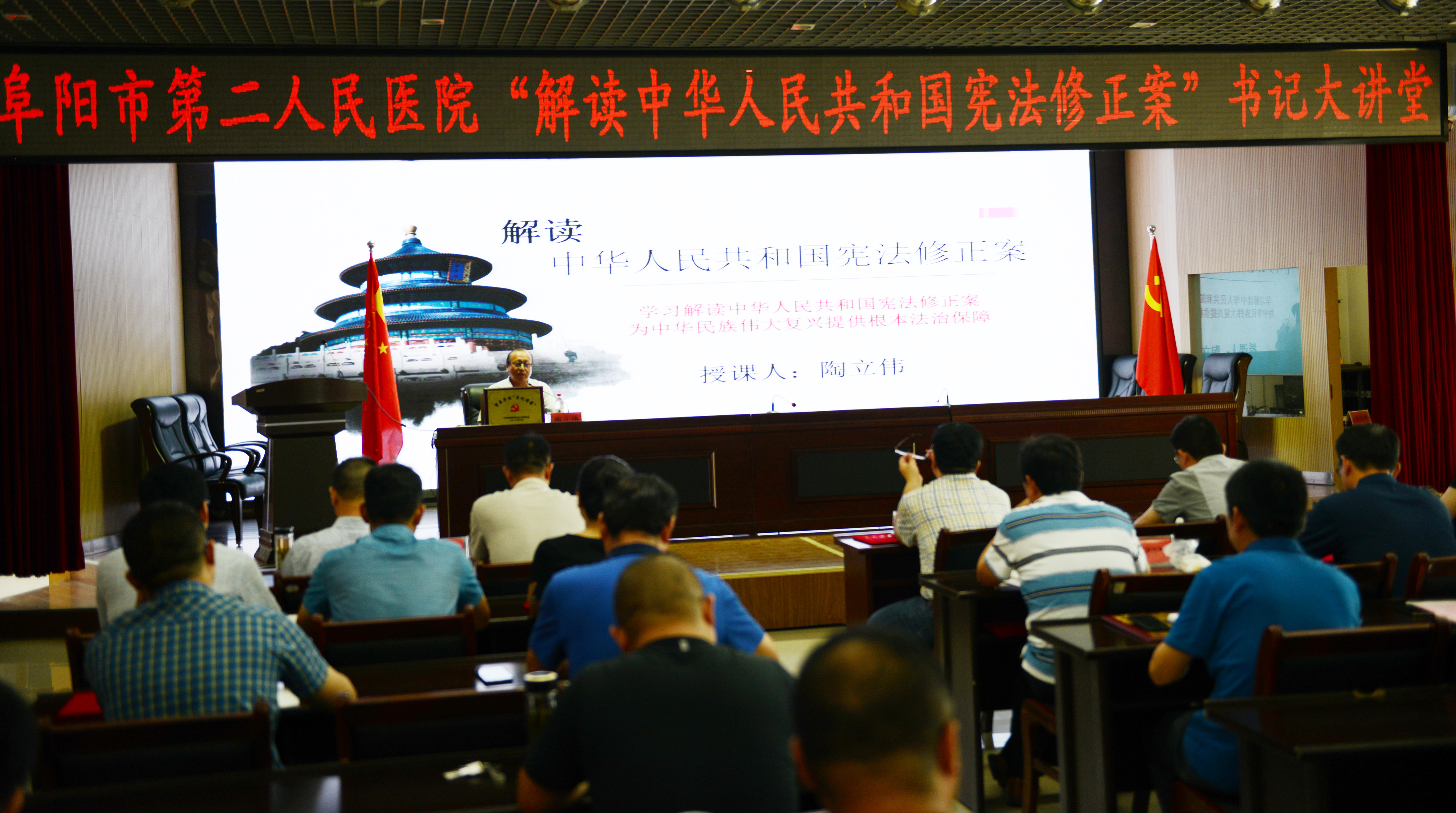6月29日,阜阳市第二人民医院在行政楼五楼开展了迎七一“书记讲堂”活动,院党委书记陶立伟以“解读中华人民共和国宪法修正案”为主题,为全院党员上了一堂党课。 会上,陶立伟讲解了《中华人民共和国宪法修正案》的相关精神,介绍了我国宪法的制定和修改历程,逐条讲解了《中华人民共和国宪法修正案》内容。陶立伟指出,《中华人民共和国宪法修正案》充分体现出宪法凝聚共识、表达民意的本质属性,体现出宪法修改程序的严谨性、严肃性,体现出我国宪法制定和修改的中国特色。经过本次修改,我国宪法将进入更加成熟、更加稳定的发展阶段,为保障国家、民族和人民利益,为新时代坚持和发展中国特色社会主义,为实现中华民族伟大复兴的中国梦,提供更加有力的法治保障。 最后,陶立伟强调,我们要充分认识宪法在党和国家事业发展中发挥着极为重要的作用,充分认识这次宪法修改的重要意义和深远影响。今后,全体党员领导干部要不断加强宪法学习,加强对国家修改宪法的认识,让宪法入脑入心,使遵守和拥护《宪法》成为工作及生活中的自觉行动。(蒋佩仑/文 王明阳/文) |