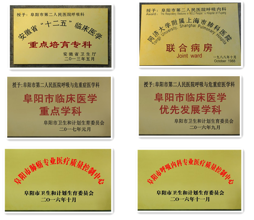 阜阳市第二人民医院呼吸与危重症医学科前身为肺科、呼吸内科,该科自1972年建院以来,在“内外结合、防治结合、理论与实践相结合、临床与科研相结合”的方针指引下,经过周质胜、时建等省内知名专家的不懈努力和40多年的不断建设和发展,现已成为阜阳市呼吸与危重症系统疾病预防、治疗、教学、科研中心,目前也是阜阳市医学会呼吸病学分会和阜阳市医学会抗菌药物学分会的主委单位。1988年10月,与同济医科大学上海肺科医院合作,建立联合病房至今。2000年被市卫生局确立为“阜阳市临床医学重点学科”,2003年被安徽省卫生厅命名的“安徽省临床医学市级重点学科”,2013年被安徽省卫生厅命名为“安徽省‘十二五’首批临床医学重点培育专科”。
