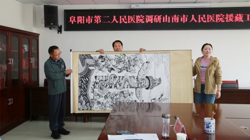 座谈会上,韩明锋代表阜阳市第二人民医院向山南市人民医院赠送了世界非物质文化遗产——阜阳剪纸作品《中国梦》,作为汉藏人民和两家医院的友谊纪念。