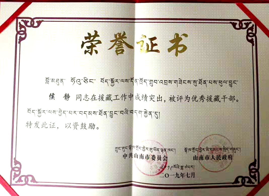 援藏期间,侯静医生克服家庭等诸多困难,充分发扬了务实拼搏、甘于奉献、顾全大局的二院精神,努力提升山南市人民医院感染病学科服务能力,为西藏卫生健康事业和维护民族团结贡献力量,被中共山南市委、市人民政府评为优秀援藏干部。