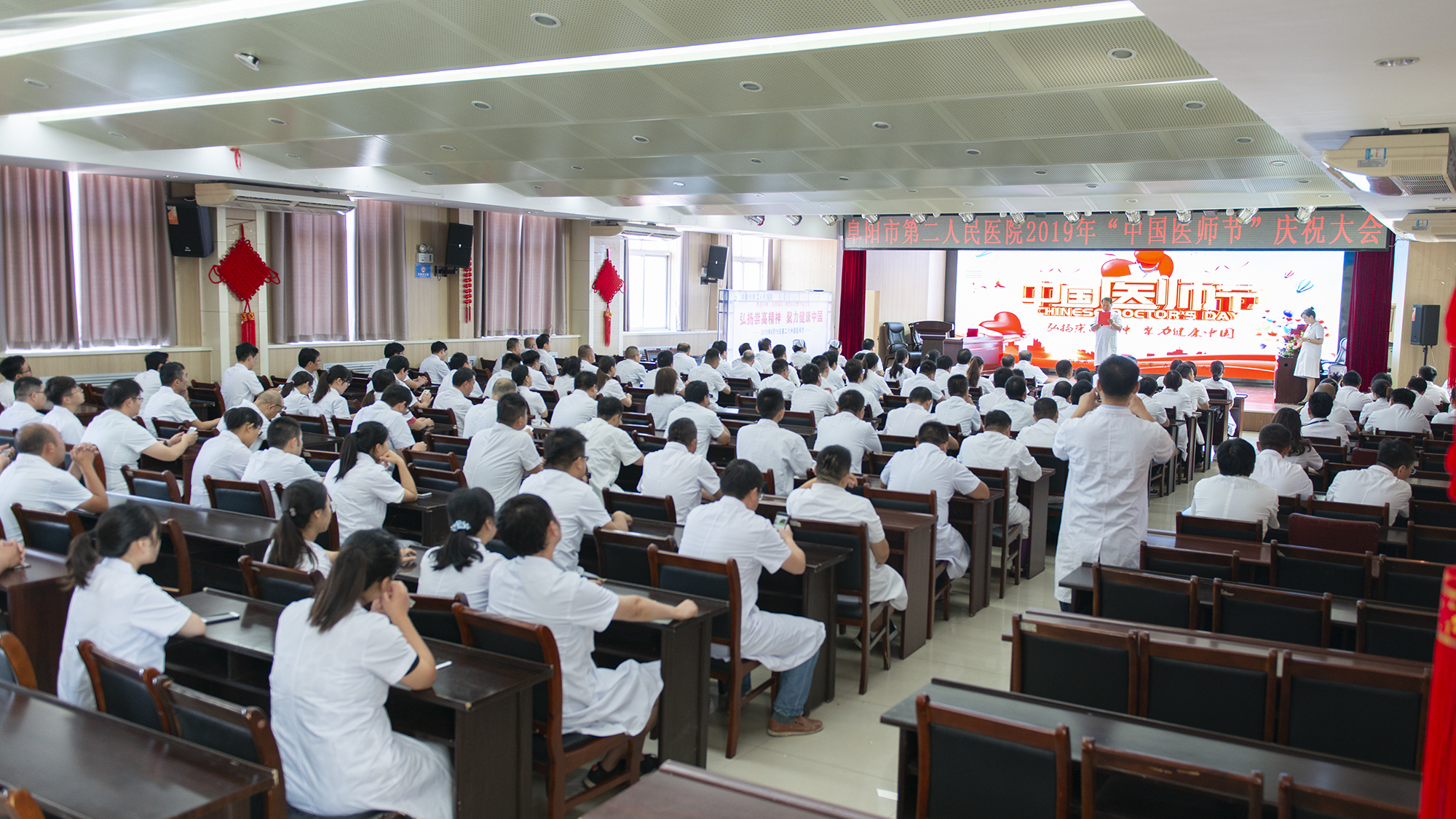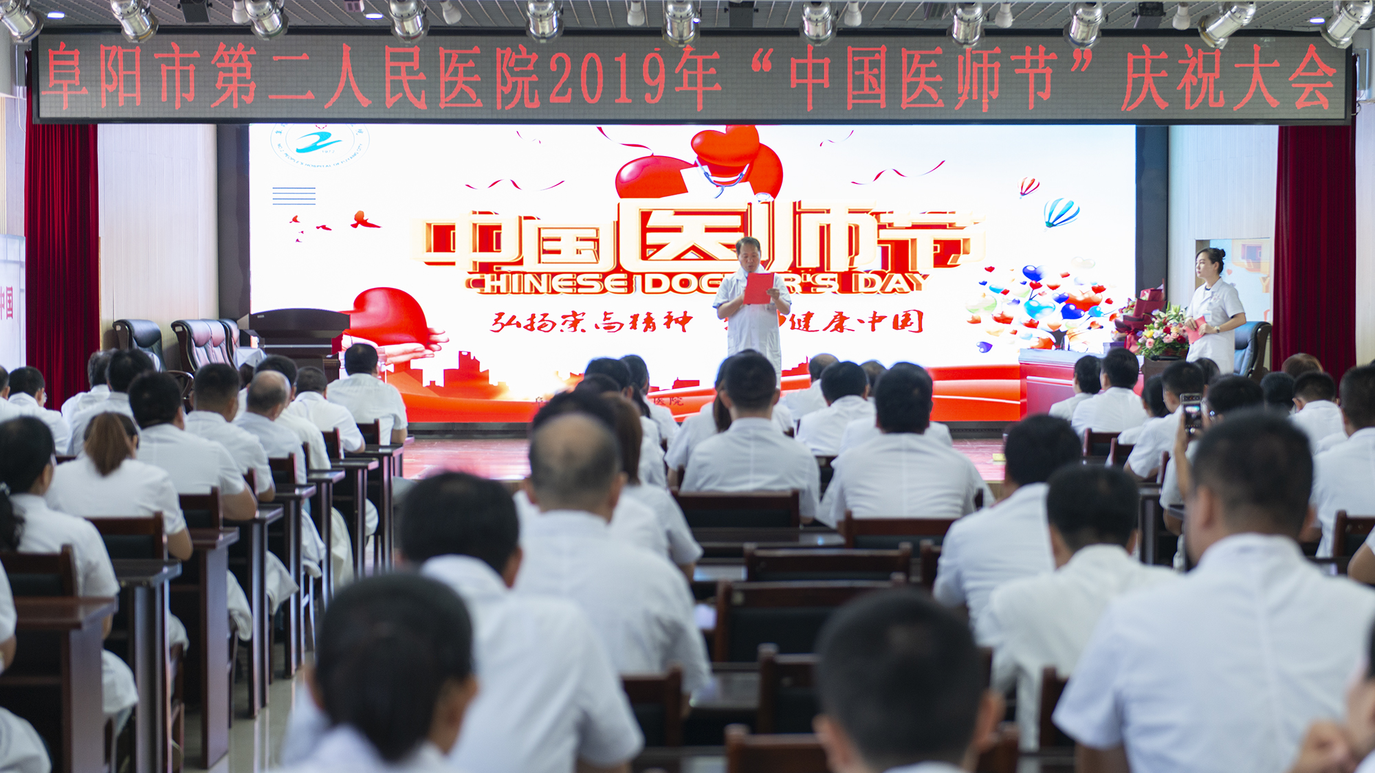 为隆重庆祝第二个“中国医师节”,大力弘扬“敬佑生命、救死扶伤、甘于奉献、大爱无疆”的职业精神,8月19日上午,阜阳市第二人民医院隆重举行2019年“中国医师节”庆祝大会。院党委书记陶立伟,党委副书记、院长韩明锋,纪委书记管海新,党委委员祖大玲与临床医技科室医师代表欢聚一堂,共享医师佳节,共述从医初心。