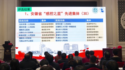 会上,主持人先后宣读获表彰集体和人员名单,阜阳市第二人民医院感染管理科获得安徽省“感控之星”先进集体,科室成员黄继峥获安徽省“感控之星”先进个人。随后在公布的新入选的感染监控网络医院及“感染预防科控制能力建设项目”医院名单中,阜阳市第二人民医院新增为安徽省医院感染监控网络医院并入选首批省级“医院感染预防和控制能力建设”项目医院。