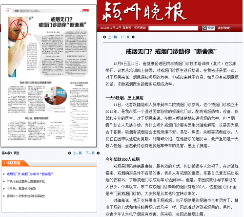 11日,记者跟随培训人员来到市二院戒烟门诊参观。这个戒烟门诊成立于2015年,是我市第一个通过国家验收的标准化门诊,配有戒烟药物、设备、仪器和专业的医生。对于烟民来说,多数人都清楚地知道吸烟的危害,但“烟瘾”却让人无法自拔,为什么呢?戒烟门诊服务医生时靖峰解释,这是因为尼古丁依赖。吸烟者戒烟后会出现烦燥不安、易怒、焦虑、失眠等戒断症状,人们往往因难以适应而复吸。时靖峰介绍,在他接诊的烟民中,最严重的是一天吸六包烟,当然最终没有逃脱烟草带来的危害,患上了肺癌。
