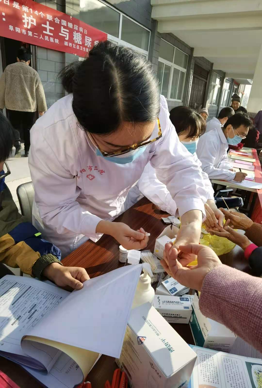 为贯彻落实《健康中国行动(2019-2030年)》有关要求,推进糖尿病防治工作,在联合国糖尿病日到来之际,11月10日上午,阜阳市第二人民医院内分泌科在颍西街道办事处郝庄社区卫生服务中心开展了糖尿病日宣传及义诊活动,主题是“护士与糖尿病”。