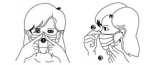 ① 确认口罩上下及内外(鼻夹边向上,深色面向外)后,将口罩罩住鼻、口、下巴。