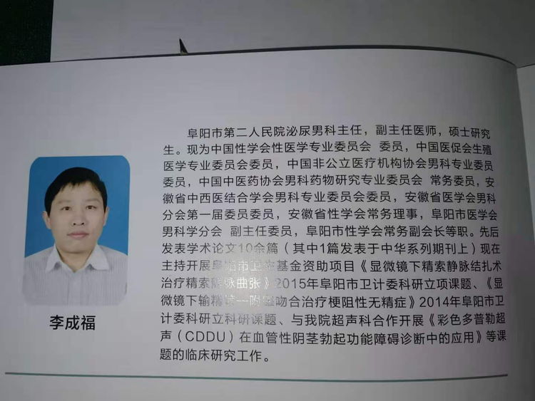 阜阳市第二人民医院男科是集男科医疗、教学、科研为一体的专业、正规的男科疾病诊疗中心。科室实力雄厚,形成了以男科前列腺疾病、男科生殖系统肿瘤、男性性功能障碍、男性不育、阴茎阴囊和精索精囊疾病的特色诊治技术。