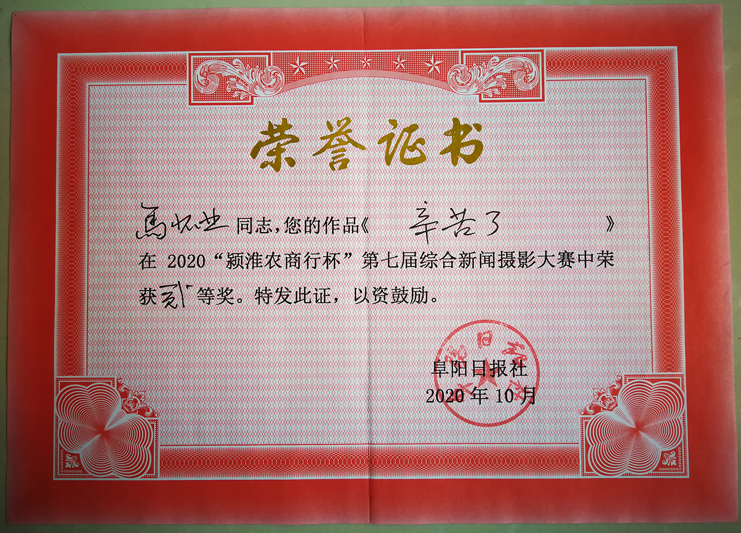 10月27日,在阜阳日报社举行的“颍淮农商银行杯”第七届综合新闻摄影大赛颁奖仪式上,阜阳市第二人民医院宣传科科长兼院长办公室副主任马怀业获得二等奖。