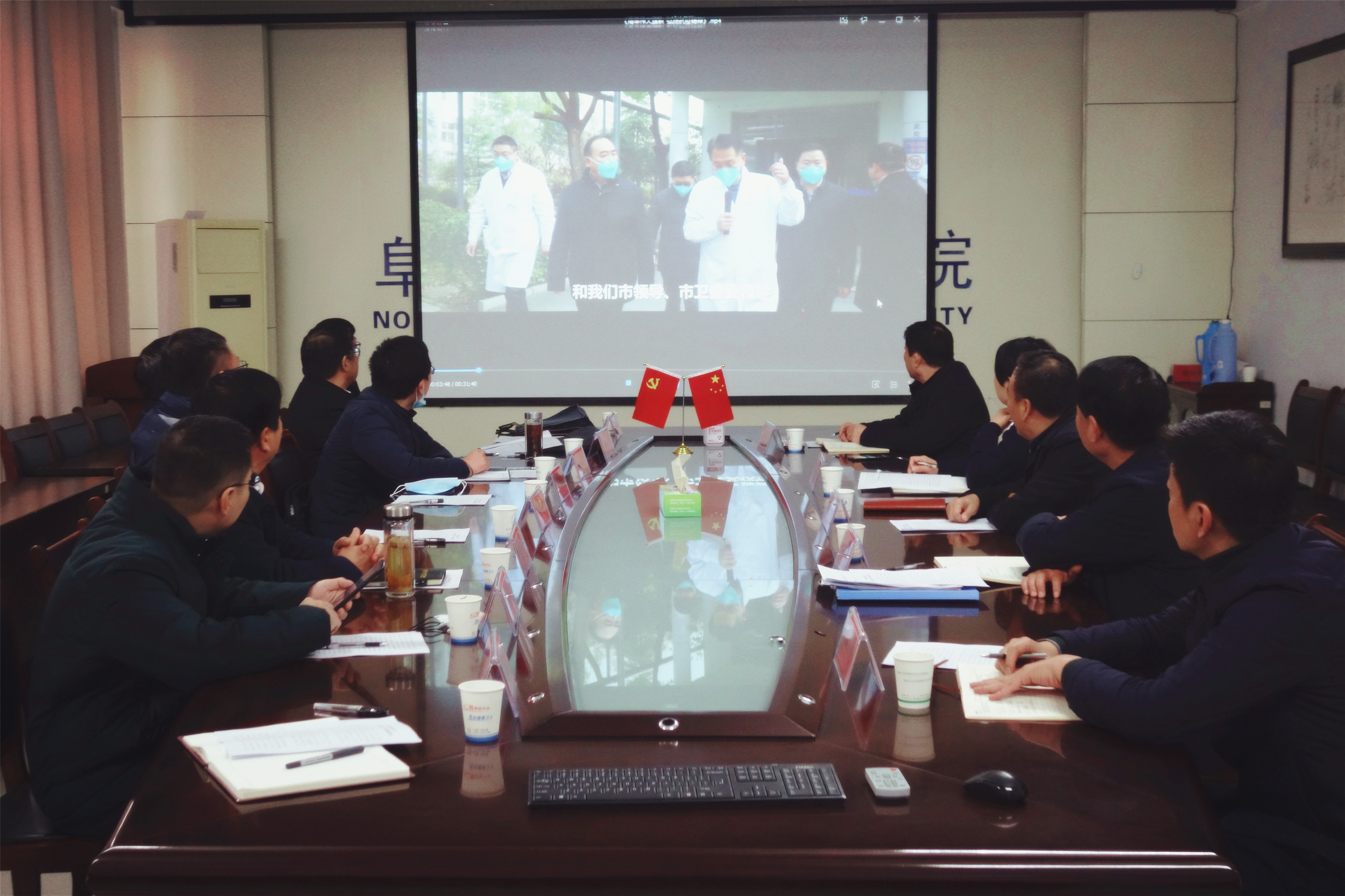 詹国庆一行观看了阜阳市二院《高举伟大旗帜 弘扬抗疫精神》宣传片。丰效寺围绕贯彻落实中办《关于加强公立医院党的建设工作的意见》和省《实施办法》,从切实加强政治建设、基层组织建设、纪律建设等方面,介绍了阜阳市二院以党的建设为抓手、全面推进医疗卫生事业健康发展情况。