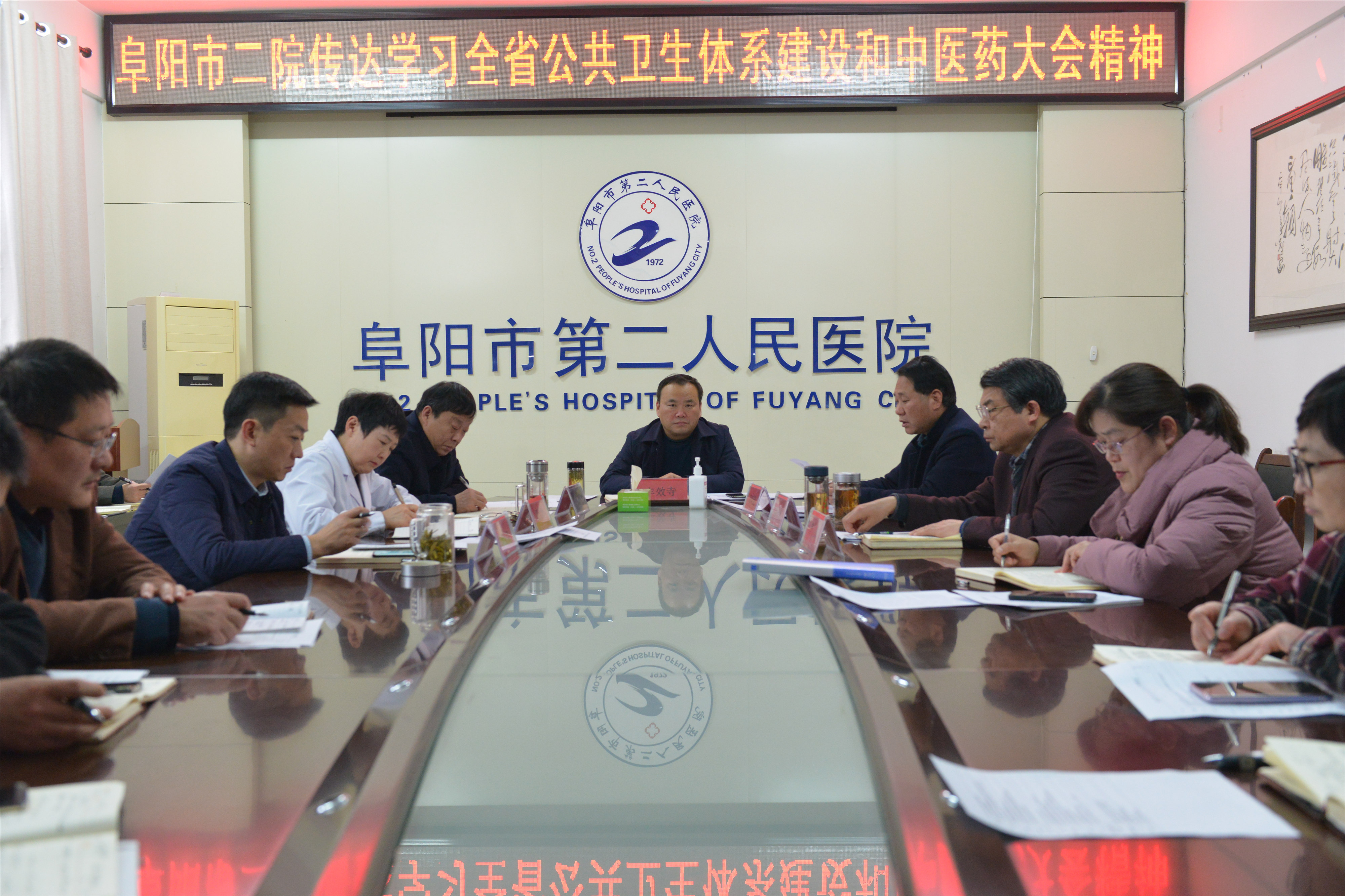 1月5日下午,阜阳市第二人民医院召开会议,深入学习贯彻全省公共卫生体系建设和中医药大会会议精神。院领导班子成员和各职能科室负责人参加了会议。党委书记丰效寺,纪委书记管海新,党委委员李龙海,党委委员祖大玲,党委委员、医务科科长麻宏亮等领导出席会议。