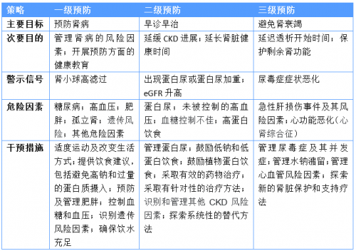 二级预防重点在于筛查早期症状,包括微量白蛋白尿、肾小球血尿和肾脏过滤功能指标(如血清肌酐和胱抑素C水平)的轻度升高。目标是延长肾脏的功能寿命和减缓CKD的进展。两个重要的目标:一、减轻蛋白尿的排泄;二、使用药物和饮食干预来降低肾小球囊内压。饮食干预措施包括低盐和低蛋白饮食,以实现每天蛋白质摄入总量达到0.6-0.8g/kg体重的理想目标,且超过一半的蛋白质来源于植物。可使用的药物有肾素-血管紧张素系统(RAS)抑制剂等。
