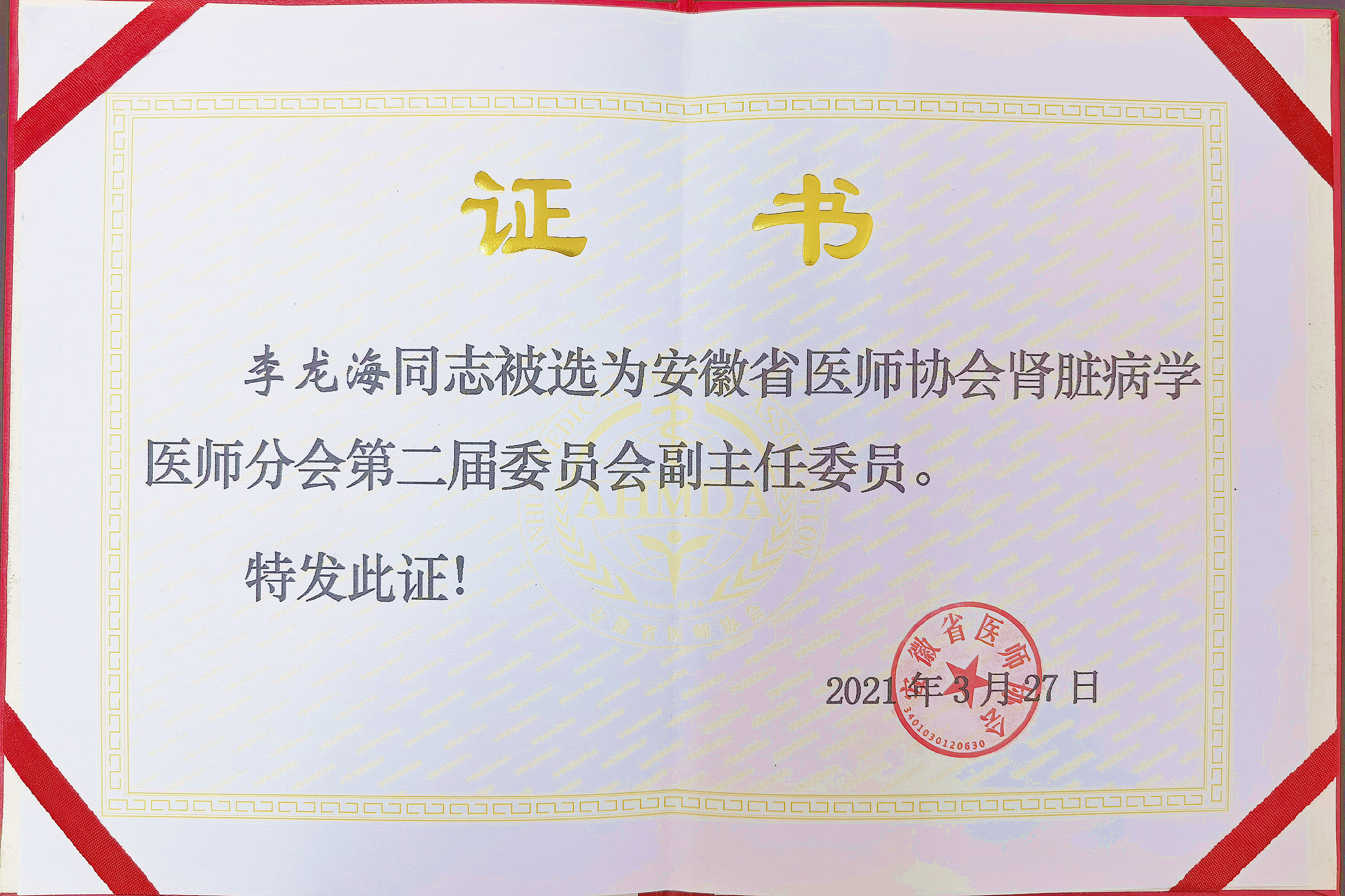 3月27日,安徽省医师协会肾脏病学医师分会第一届委员会换届选举大会在合肥召开,阜阳市第二人民医院李龙海应邀参加,并当选为分会第二届委员会副主任委员。
