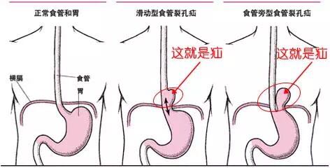 食管裂孔疝分为4型:I型为滑动性食道裂孔疝,指平卧位或头低位时胃食管连接部经食管裂孔进入纵膈,当改变体位时可自行回纳;Ⅱ型即食管旁裂孔疝,胃食管连接部保持正常位置,胃底部经食管裂孔疝入胸内食管旁;III型即混合型食管裂孔疝,指I型和Ⅱ型两种情况同时存在,且贲门上移进入胸部;Ⅳ型即巨大型食管裂孔疝,其特点是除了胃外,还疝入腹内其他脏器。I型裂孔疝主要为反流症状,伴有严重反流症状且长期内科治疗无效的I型滑动性食管裂孔疝需手术治疗。Ⅱ型和Ⅲ型裂孔疝主要为胃疝入胸腔导致的机械性梗阻症状。由于Ⅱ型和Ⅲ型裂孔疝有能会发生致命性的并发症,如胃绞窄、穿孔、梗阻、出血和呼吸方面的并发症,所以普遍认为对Ⅱ型和Ⅲ型无论有无临床症状均应及时手术治疗。巨大型食管裂孔疝(IV型)是否可行腹腔镜手术目前尚无定论, 可能以开胸或开腹手术为首选。
