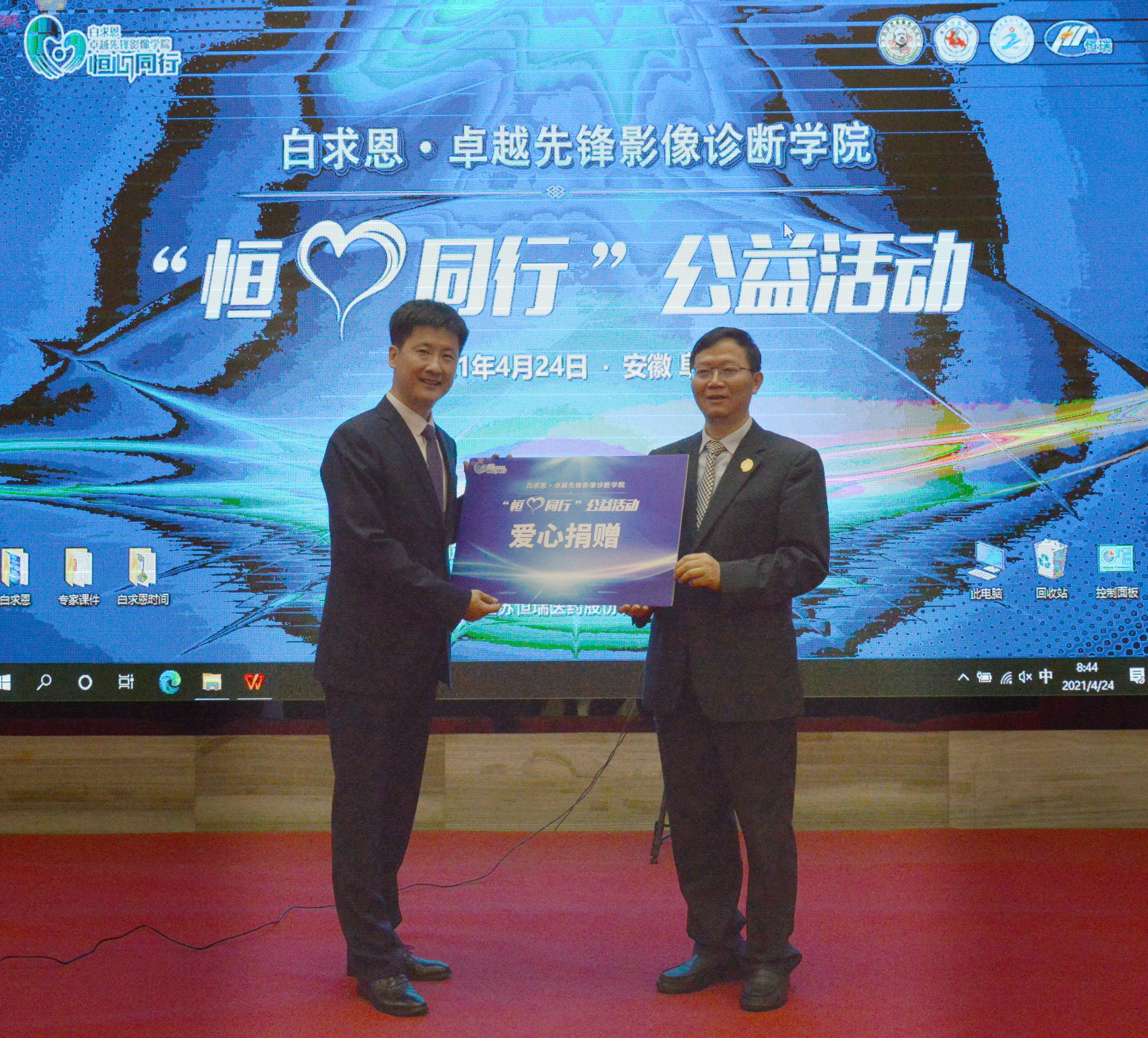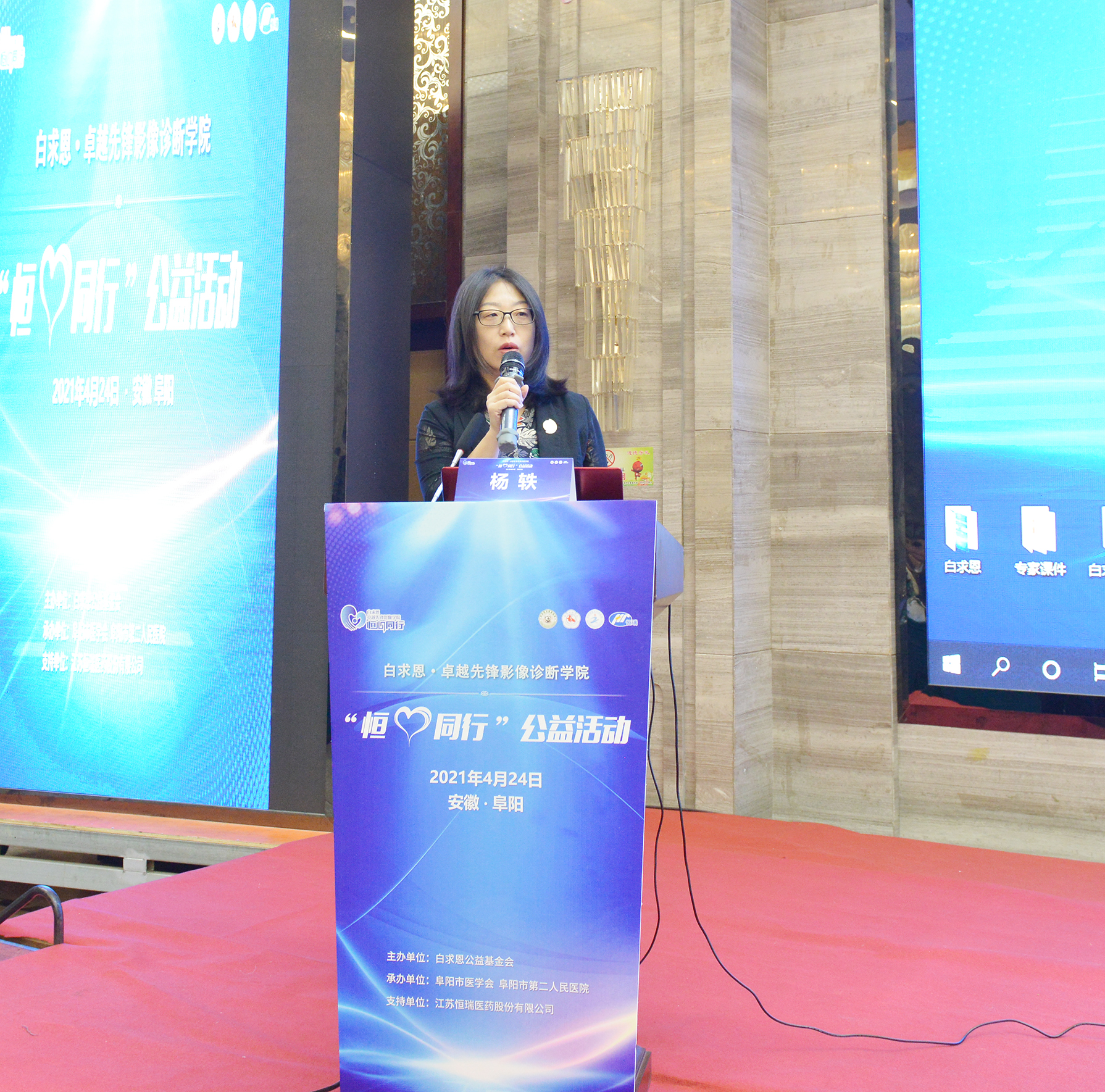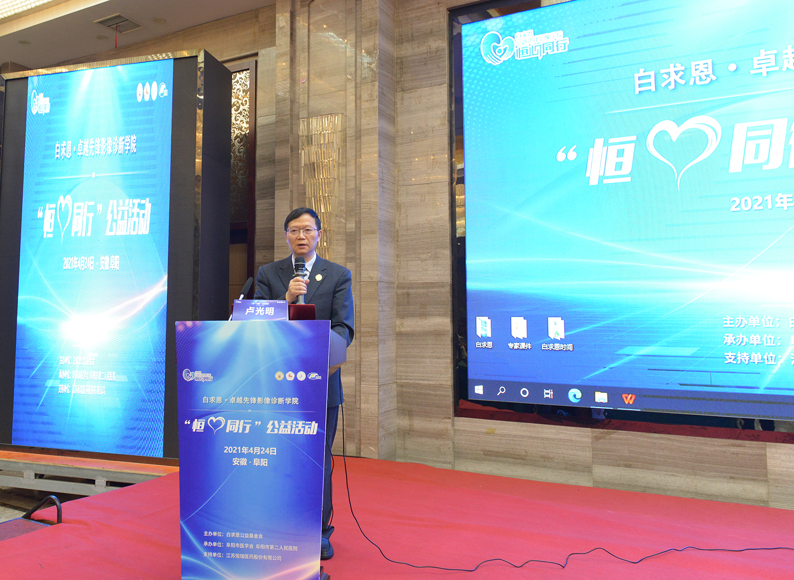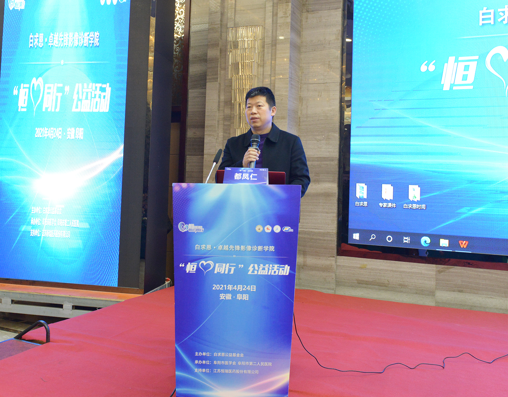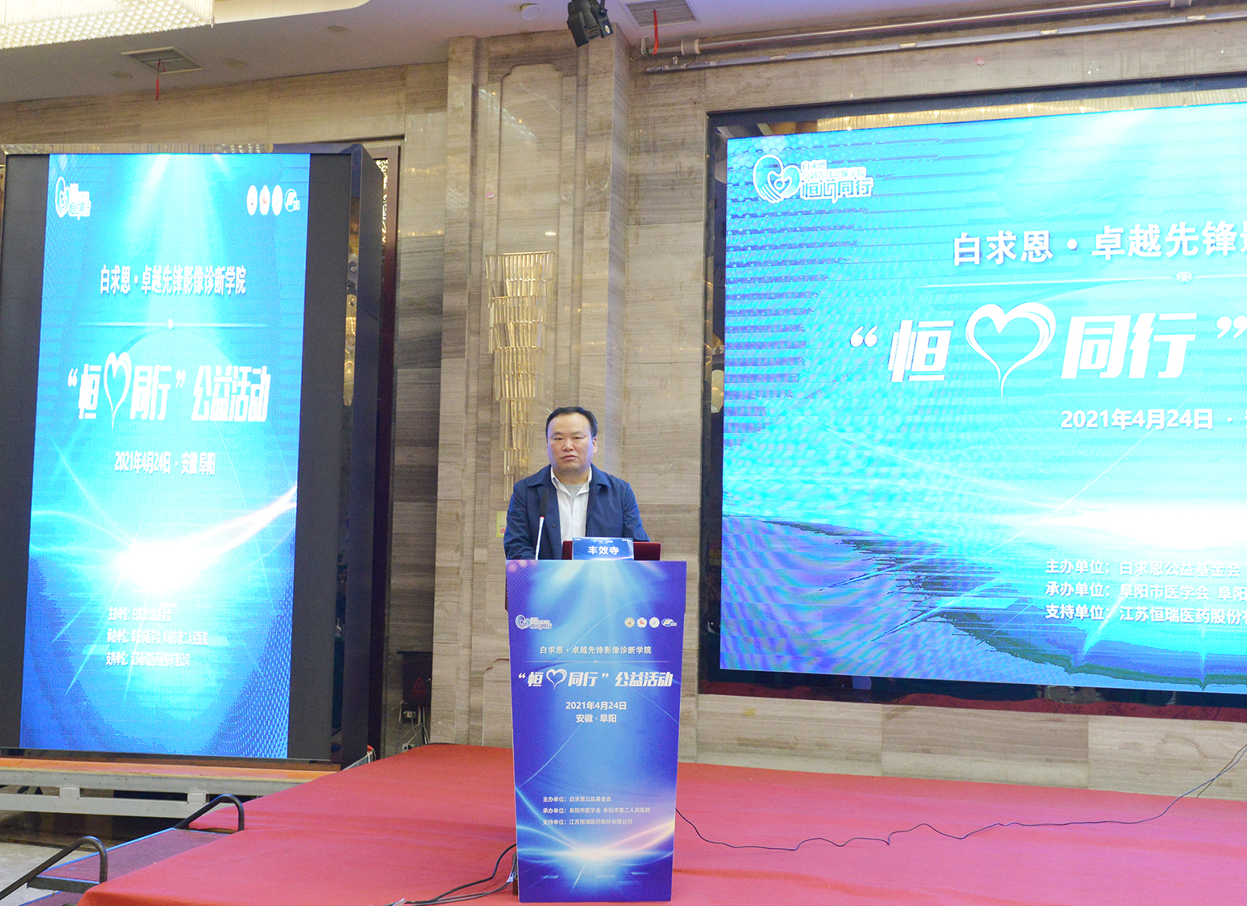据参加本次活动的白求恩公益基金会副秘书长杨轶女士介绍:为弘扬白求恩精神,推动我国影像医学平衡发展,白求恩公益基金会影像诊断专委会于2019年启动“白求恩·卓越先锋影像学院——‘同行同行’及‘恒心同行’系列公益活动,旨在通过对地市级三级甲等医院影像学科带头人或其培养对象的交流帮助,提高其学术能力和学术领导力,提高基层医院影像学科同行专业技术水平,形成以地市级三级甲等医院为枢纽的交流平台,促进基层医院影像学科的发展。本次阜阳站公益活动由白求恩公益基金会主办,阜阳市医学会和阜阳市第二人民医院承办,江苏恒瑞医药股份有限公司协办。活动邀请了全国多名影像学著名专家前来授课及指导。他希望在今年是建党100周年和白求恩同志逝世82周年之际,通过这项公益活动,在阜阳这个有着红色传统的地区把白求恩精神代代相传,让培养对象及合作导师紧密联系,让更多的专家深入到基层医院和贫困地区,帮助更多需要帮助的人,为提高影像均质化而努力,造福患者,为健康中国助力。