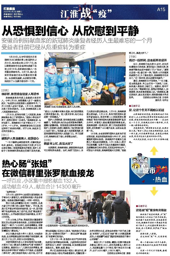 安徽首例捐献血浆的新冠肺炎康复者经历人生最难忘的一个月 受益者目前已经从危重症转为重症。